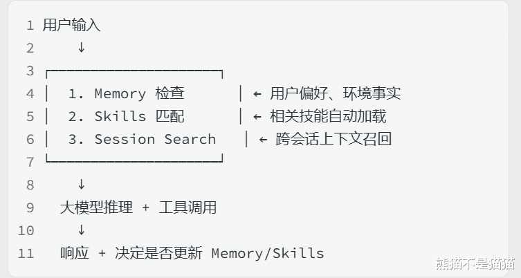 从Hermes给我们的数据流可以看到,当用户发起会话时,Agent会先检查Memory记忆,这一点和Openclaw一样,随后根据会话的内容自动取加载匹配需要的skills,当完成这些之后最关键的点来了。Openclaw在完成这一步之后就会直接开始调用skills或者工具输出内容,而Hermes多了跨会话上下文搜索的步骤。