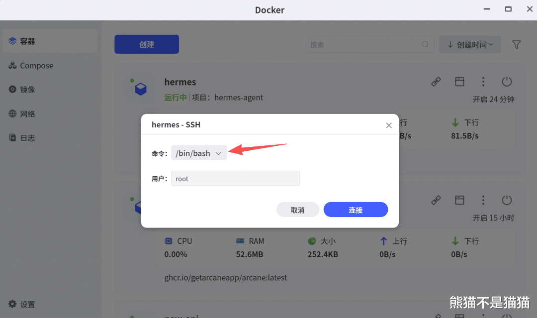 随后直接启动项目,待启动完成之后,我们需要通过极空间的SSH功能来配置聊天渠道和设置模型,命令记得选择bash。