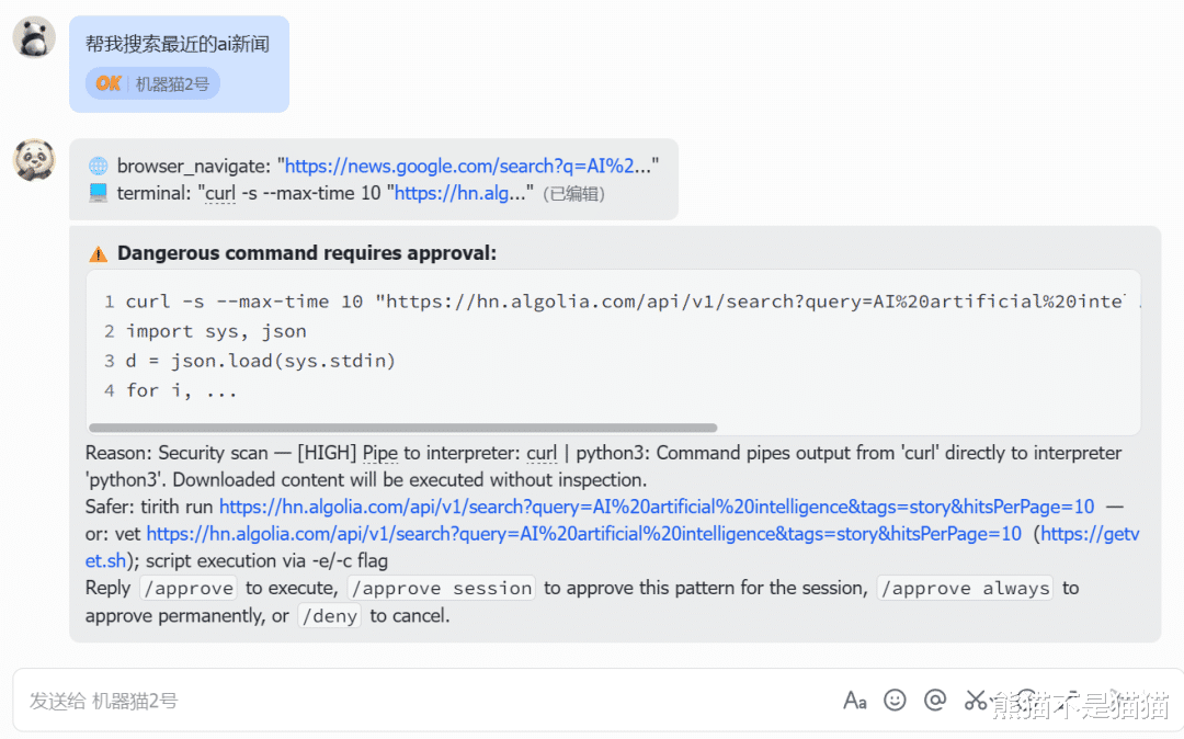 "虾"和"马"的不同之处首先是会话模式的不同,Hermes的会话会在聊天窗口将工具的调用以及log日志都逐一显示(可以选择关闭),不会出现像虾一样的长时间没有动静,让你觉得它已经去世了。
