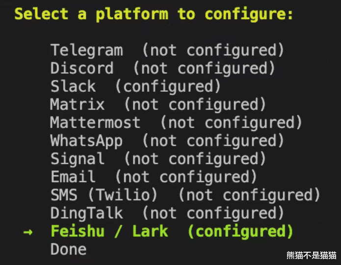 输入hermes gateway setup就能看到渠道设置,目前官方在国内支持的只有飞书、企微以及钉钉,但也可以通过插件的形式来实现QQ等渠道的支持。和Openclaw一样,我们需要获取飞书机器人的APP ID以及App Secret。