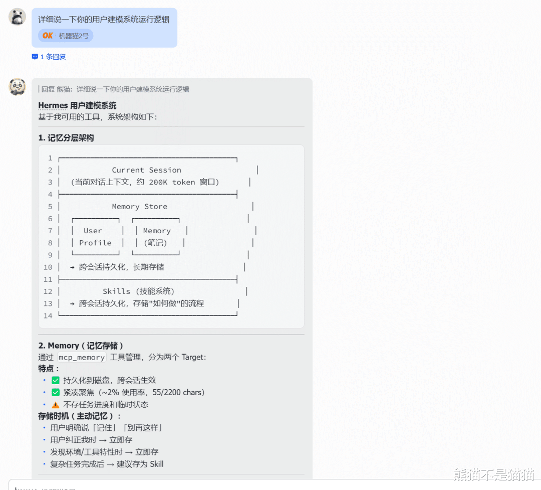 Hermes最大的特性就是闭环学习能力,同时对于用户画像也能进行跨会话理解,不会存在突然new了一个新会话导致之前的记忆有丢失,这是目前我觉得对比Openclaw体验最佳的点。