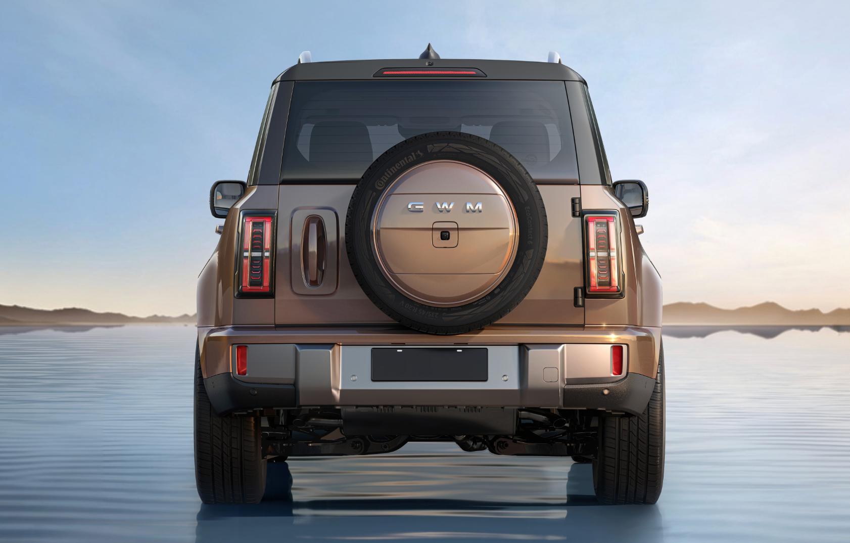 车尾部分,后尾门使用了侧开式的结构,带有背挂式的备胎。尾灯使用了矩形轮廓,带有亮黑色边框装饰。后杠造型和前杠相呼应,双出的排气管使用了隐藏式布局。
