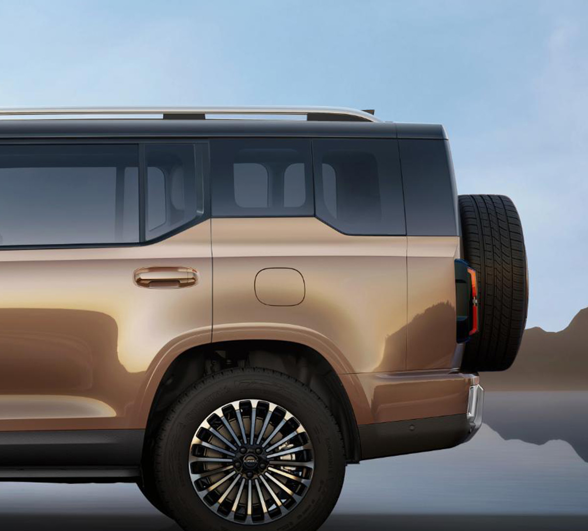 后翼子板上部向上延伸的造型很个性,另外其后侧窗是由两块玻璃组成,后翼子板后部还有竖向的拼缝,向上与后侧窗后部缝线呼应,延伸到车顶位置。