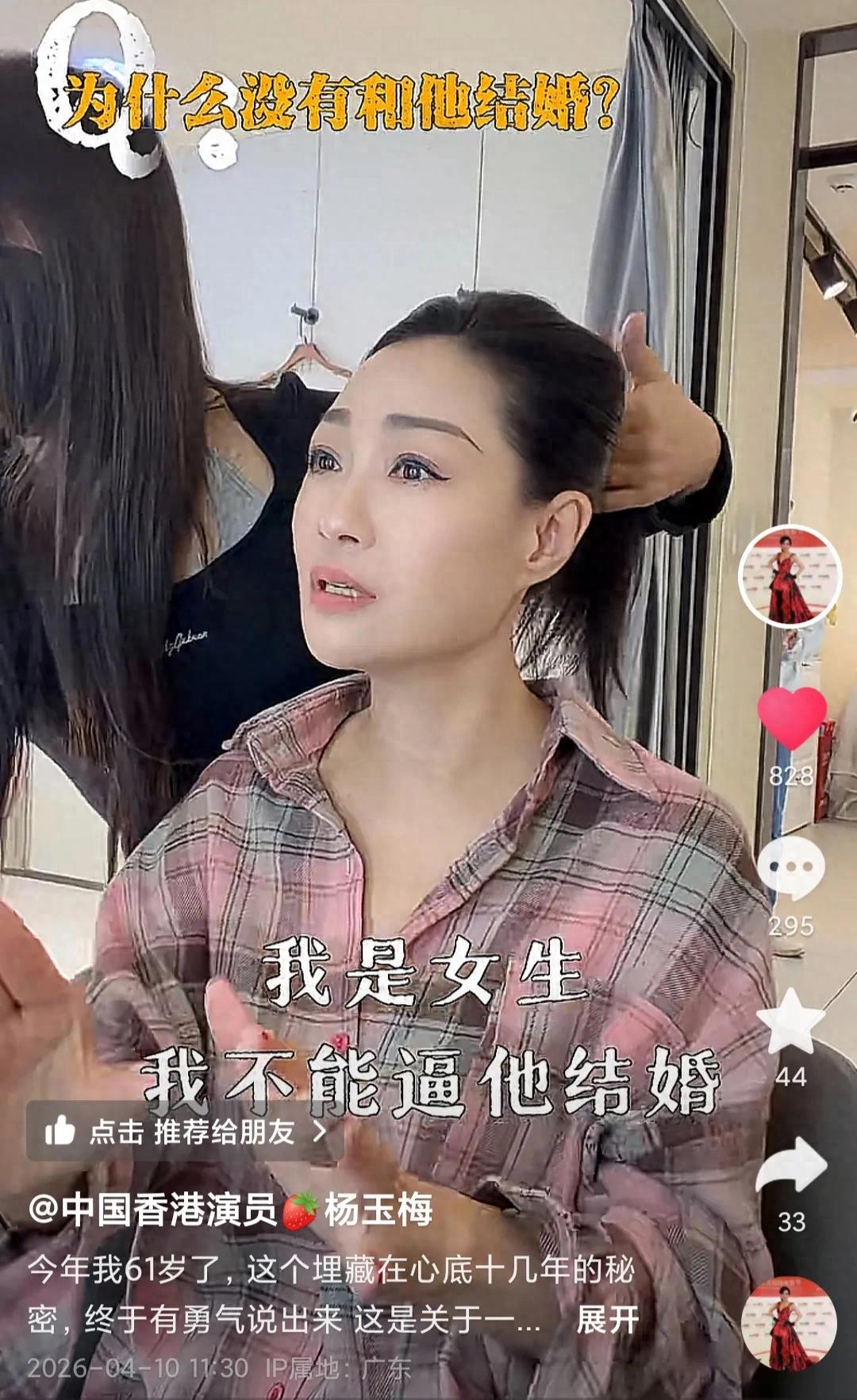4月10日,香港知名女星杨玉梅在个人社交账号上分享了一段视频,首度公开谈及过去的感情经历,还忍不住哭诉至今没结婚的原因。