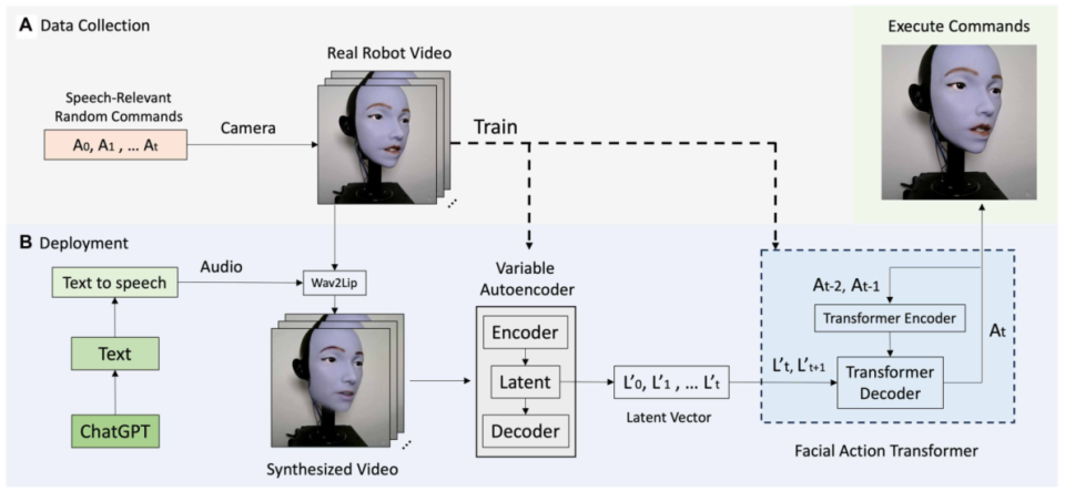 图3 机器人唇同步的自监督学习框架。(A)数据收集阶段涉及机器人通过与语音相关的随机命令自动生成数据集,用侧视图相机捕捉各种嘴唇运动以获得3D嘴唇形状数据。(B)部署过程从来自ChatGPT的文本输入开始,这些文本输入被转换成音频,然后合成机器人视频。真实机器人视频和命令用于训练由编码器和解码器组成的机器人逆变换器,以产生用于真实机器人执行的平滑和准确的电机命令。