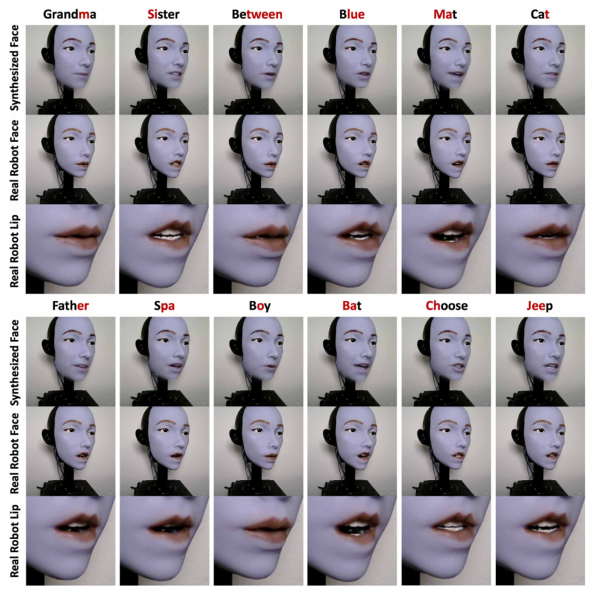 图6 不同语音环境下的机器人嘴唇运动。该图展示了机器人对各种单词的嘴唇形状的综合预测以及真实世界的机器人性能,说明了学习模型如何从模拟推广到物理执行。