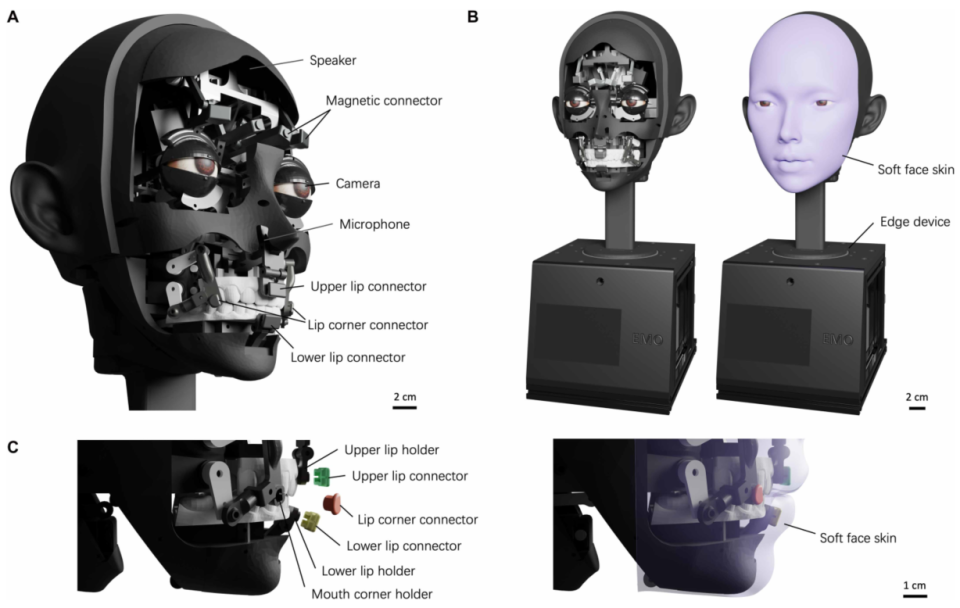 图1 机器人头部设计具有先进的机械关节。(A)面部机器人设计概述,强调人机交互的关键组件,包括扬声器、麦克风、高分辨率摄像头模块和固定柔软硅胶面部皮肤的磁性快速释放连接器。连接器允许精确对准,并允许皮肤的推拉运动,便于对语音清晰度至关重要的复杂嘴唇运动。(B)具有柔软硅树脂皮肤的人形机器人的外观。边缘计算设备容纳在基座中。(C)嘴唇驱动系统的详细视图,显示了上部、下部和角部嘴唇连接器,每个都连接到相应的嘴唇固定器上。柔软、可更换的面部皮肤使用磁性连接器固定,并且可以很容易地拆卸下来进行维护或定制。