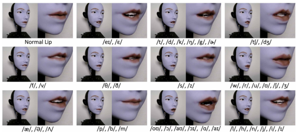 图2 面部机器人的嘴唇发音动作和相应的语音符号。该机器人展示了其重现关键英语音标的能力,如爆破音(/p/和/b/)、双音节音(/m/)和圆元音(/u/和/o/)。每一帧捕捉通过独立控制上嘴唇、下嘴唇和上嘴唇而实现的典型嘴唇运动。这些结果是机器人说话时产生正确嘴唇排列能力的基础。