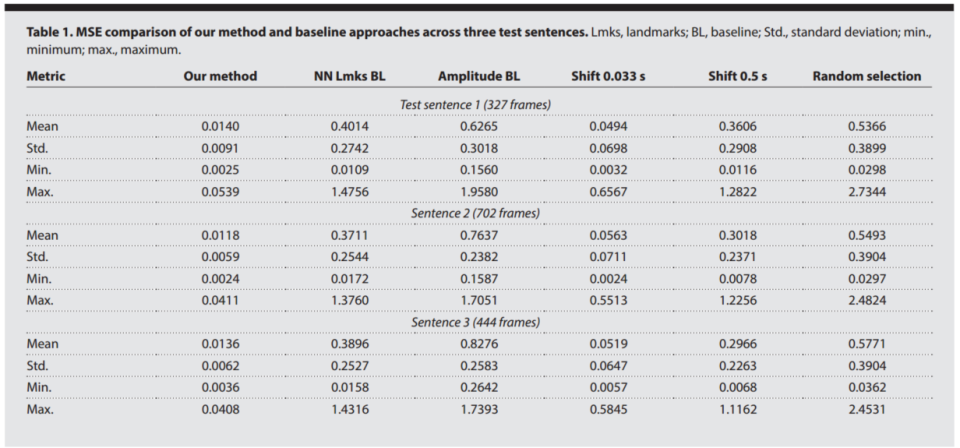 他们设计了一个严格的对比实验。用ChatGPT生成了3段测试文本,每段300~700帧。对比5种基线:最近邻(用Mediapipe提取唇部关键点做匹配)、幅度映射(仅根据音频幅度开合下颌)、0.033秒时移、0.5秒时移、随机选指令。