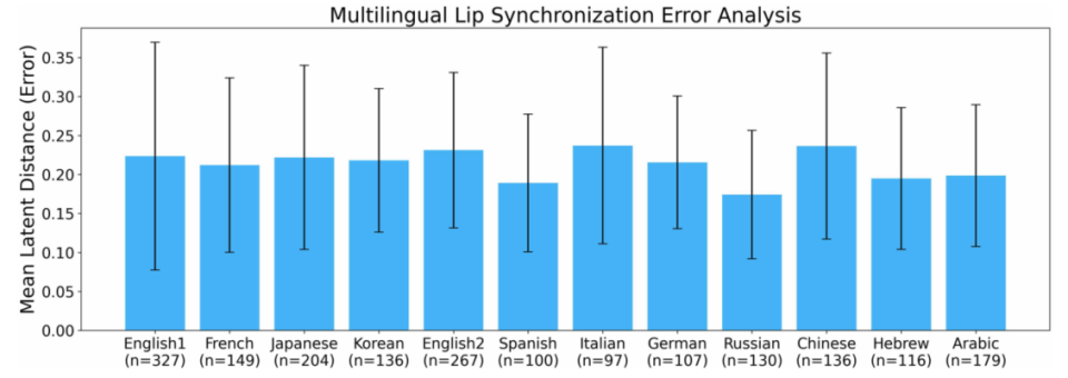 图5 多语言唇同步性能。每种语言的平均潜在距离误差用误差条表示SD。每种语言的样本大小n(显示在x轴标签下方)反映了该语言的测试句子中的视频帧数。结果表明,所有非英语语言的同步误差都保持在英语1的范围内,这表明跨语言泛化能力很强。