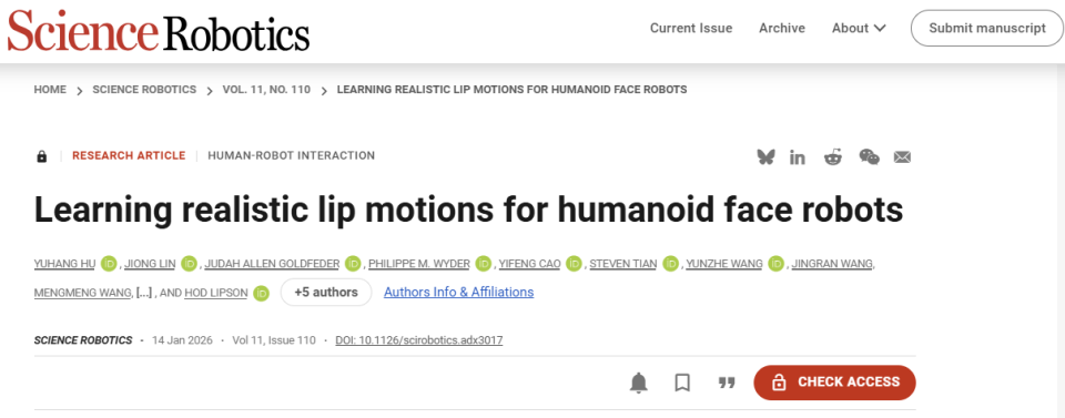 引文格式:Hu Y, Lin J, Goldfeder J A, et al. Learning realistic lip motions for humanoid face robots[J]. Science Robotics, 2026, 11(110): eadx3017.