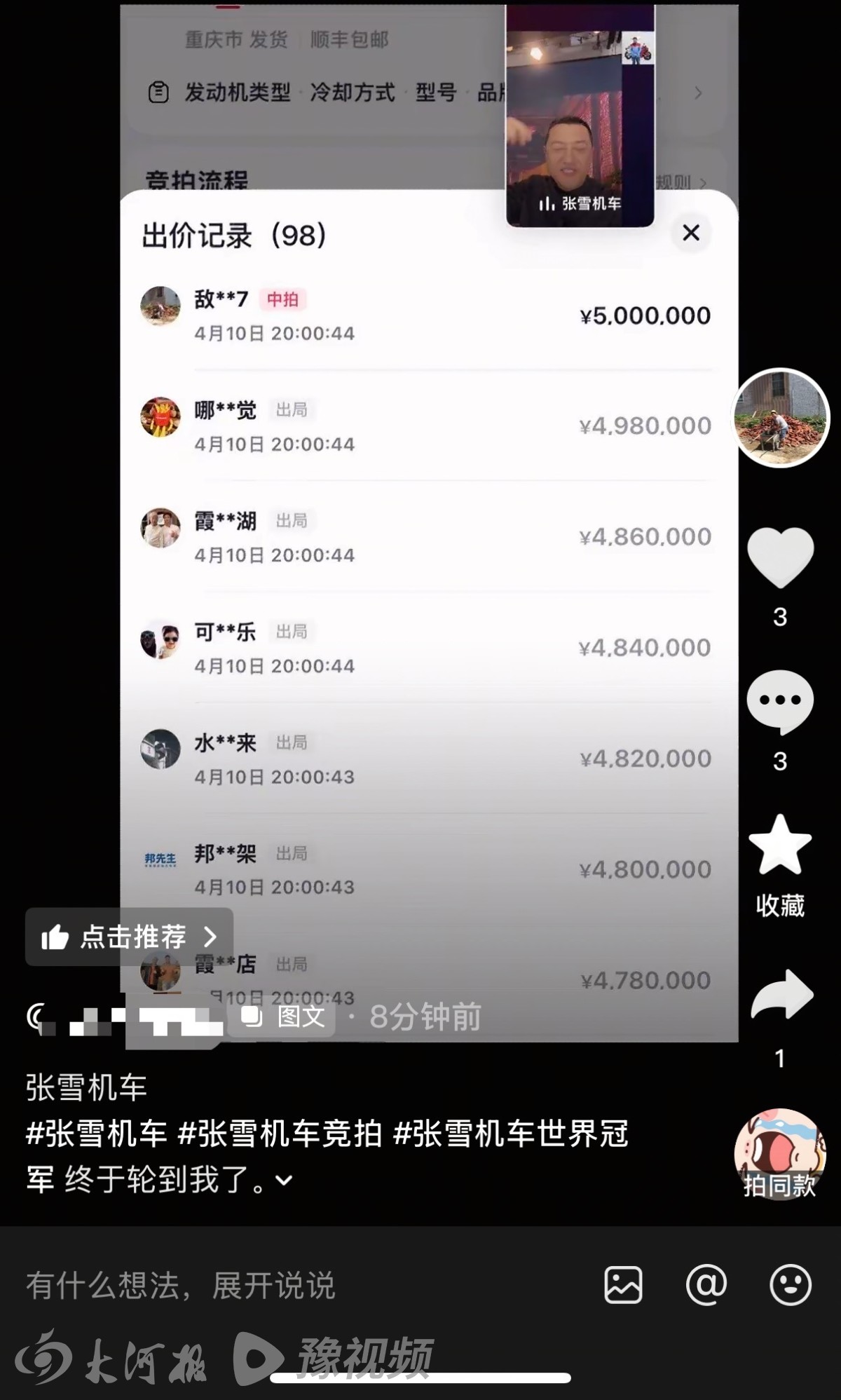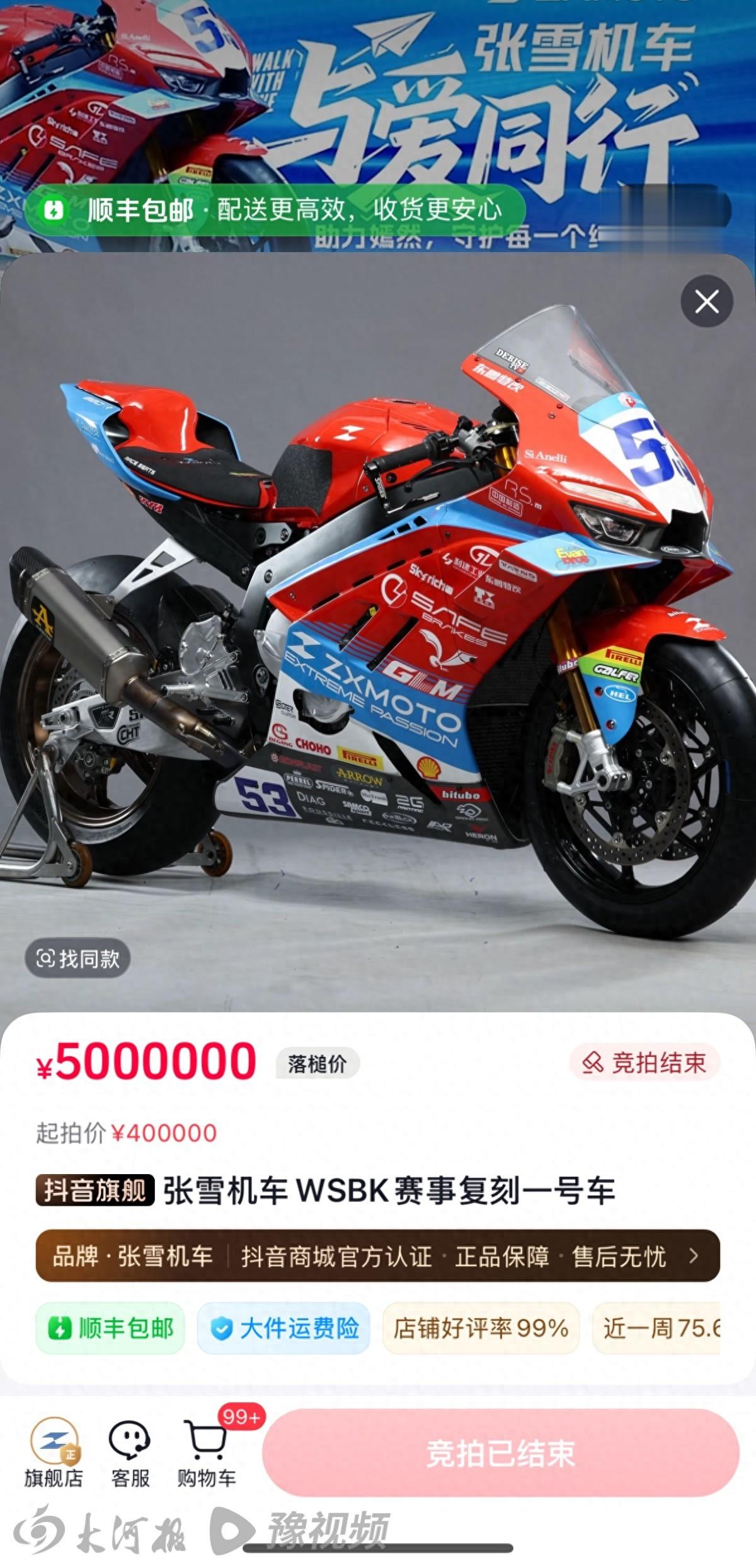 4月10日晚8点,张雪机车“WSBK冠军赛车复刻版”以500万元封顶价拍出。