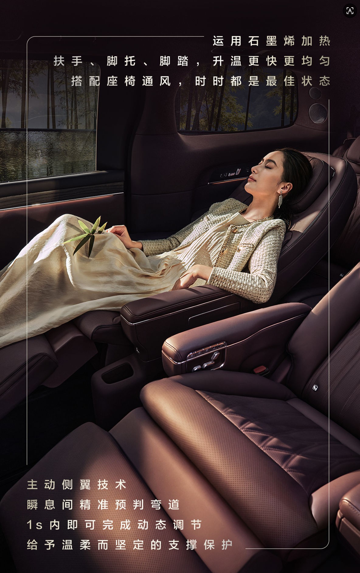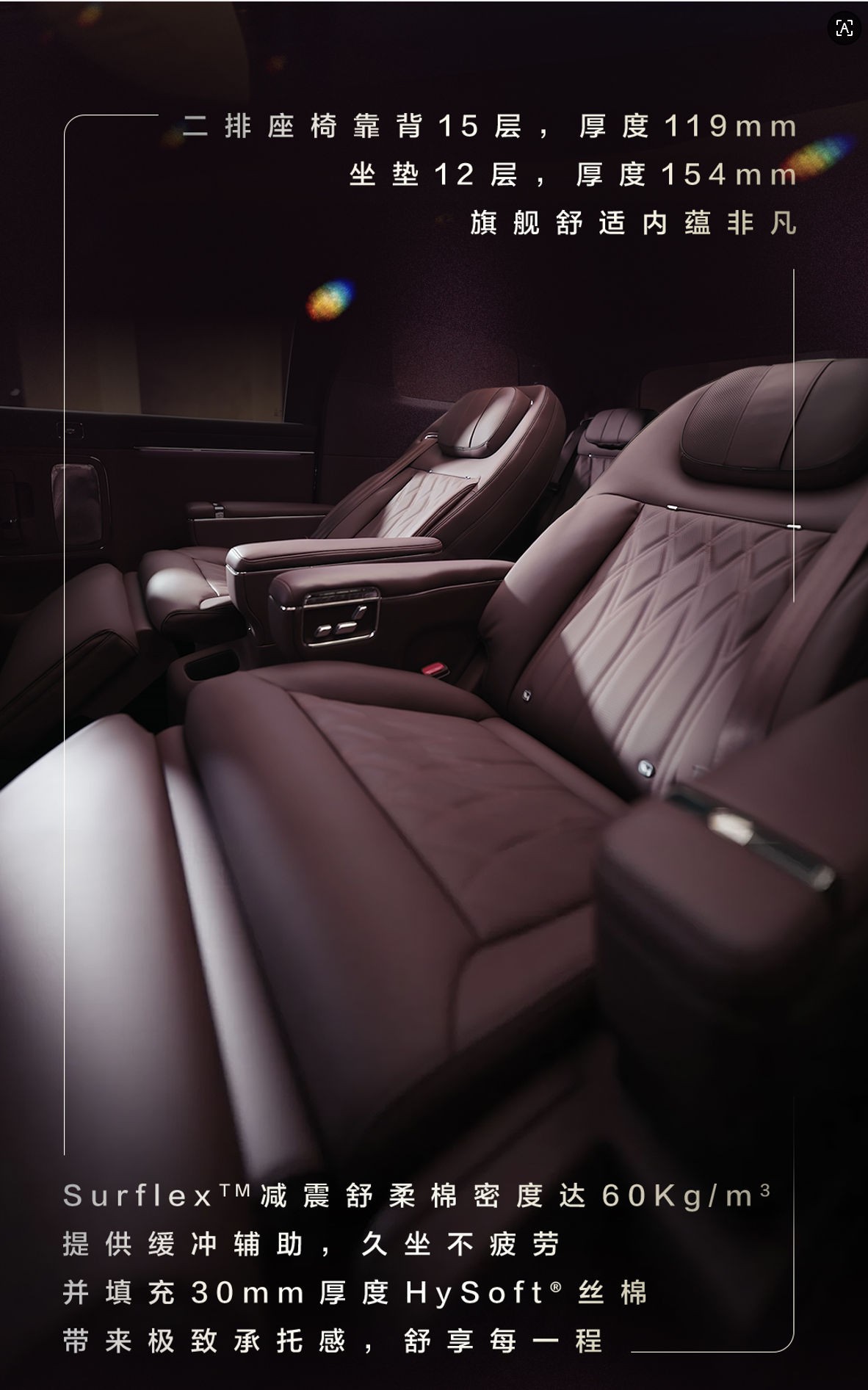 座椅硬件更达行业天花板:二排15层靠背(119mm厚)+12层坐垫(154mm厚),搭载60Kg/m³ Surflex™减震棉与30mm HySoft®丝棉,软而不塌。功能上双零重力座椅123°超大夹角,右侧1.05米超长腿托;超舒享按摩4.2倍穿透力、40倍频率,解决传统按摩“只触表皮”问题。材质采用全粒面Nappa真皮+半苯胺皮革,扶手、脚托配备石墨烯加热,细节拉满豪华感。