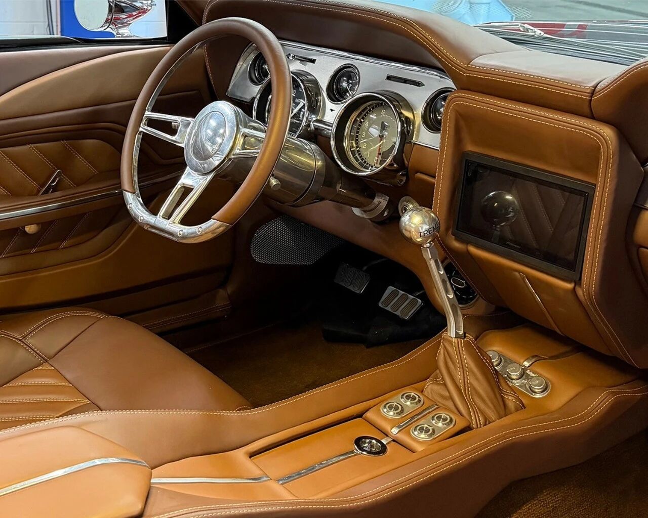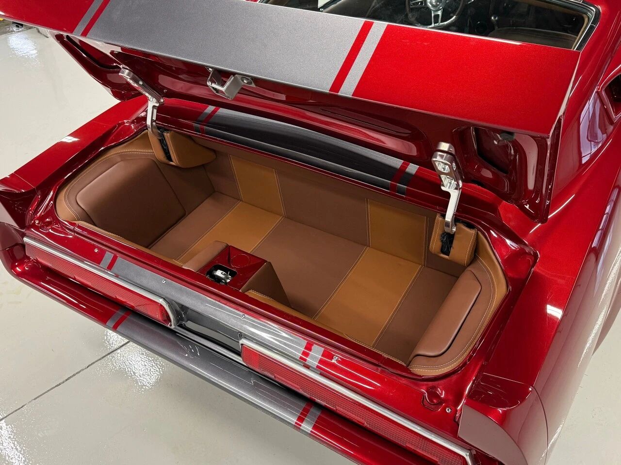 内饰部分则完全跳出了美式老肌肉车的粗犷风格,走向豪华精致路线。座舱大面积采用Cognac与Saddle双色真皮包裹,质感堪比欧系豪华GT。定制中控、 Pioneer触控大屏、AutoMeter Phantom仪表组合,既保留了复古气质,又融入现代舒适体验。这种奢华甚至延伸到了后备厢,同样的真皮包裹搭配定制皮革行李箱,精致到极致。