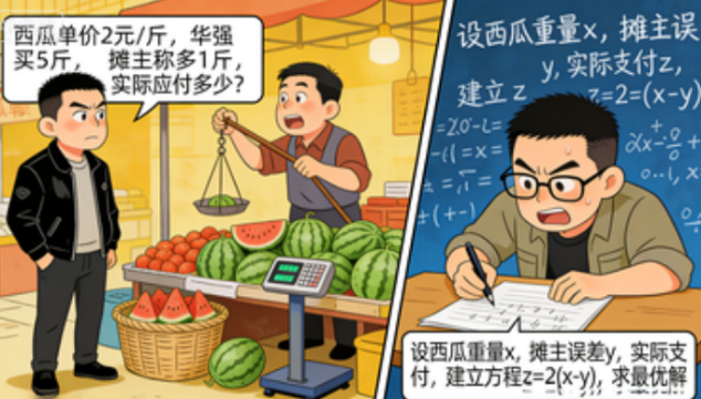 现在网上的二创内容五花八门,从最简单的入门版,把老板缺斤短两的剧情改成小学应用题,让大家算算老板一共坑了多少钱,到进阶版用高等数学的模型解构整个买瓜冲突的逻辑,把每个角色的行为都用数学公式推导出来。