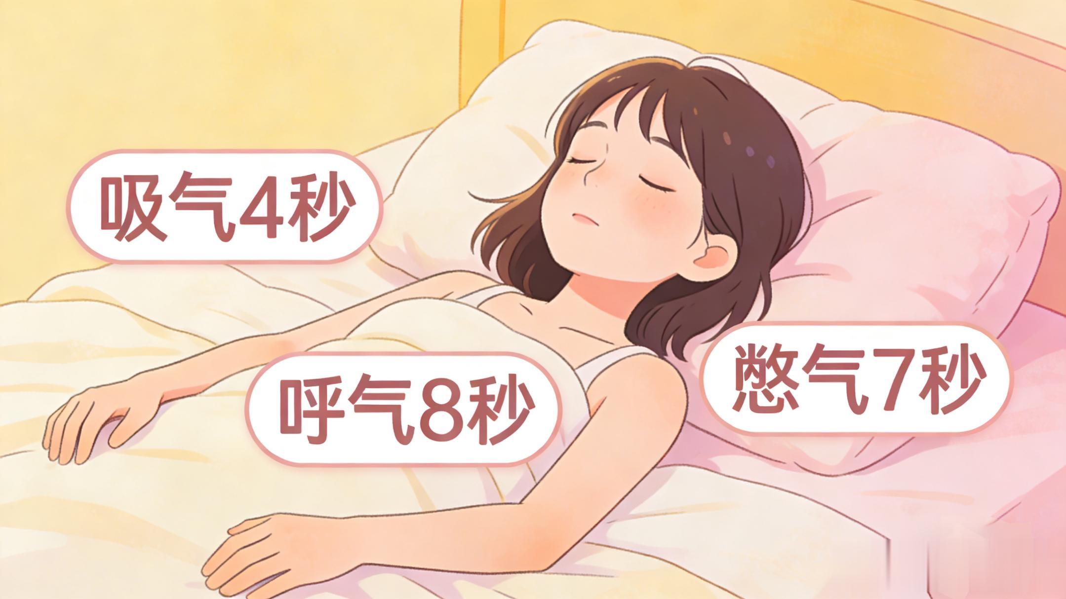 用鼻子安静吸气4秒,屏住呼吸7秒,再用嘴巴慢慢呼气8秒。