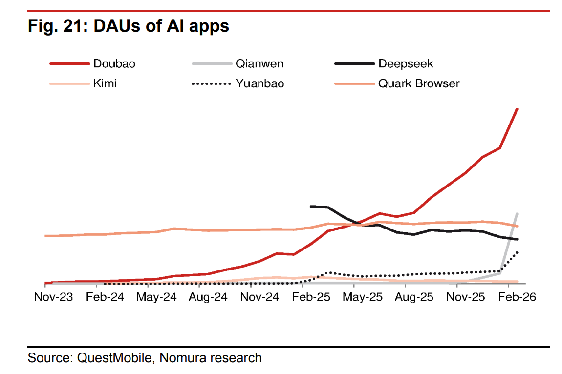 春节档阿里给千问App投入了巨量资源,财报里披露2月MAU已经超过3亿。但这目前应该还不足以动摇上面这个“双寡头”判断。
