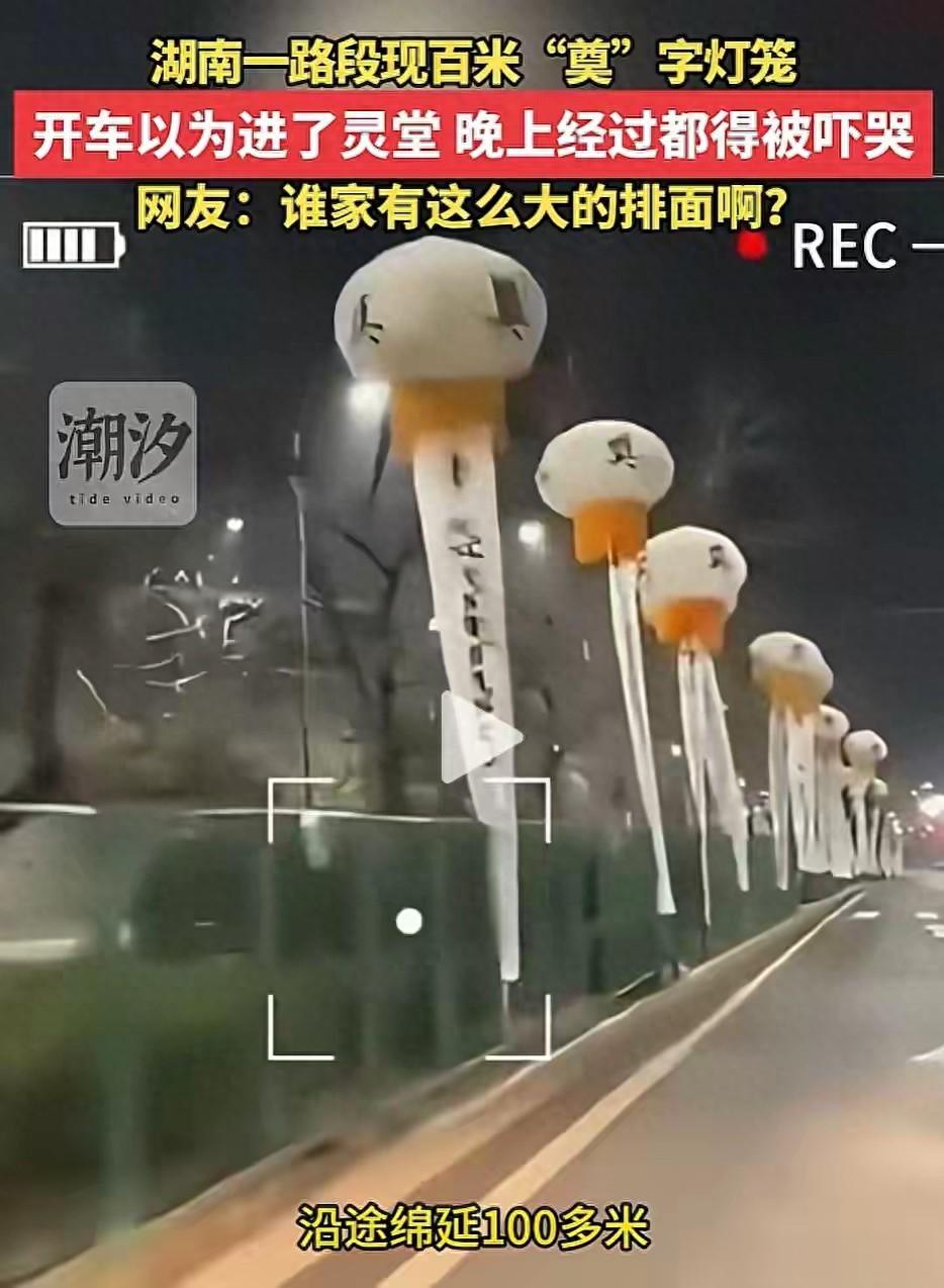 在2026年4月9日至10日期间,祁东县一段农村公路的护栏和绿化带上,被密集地插满了绵延上百米、约两米高的白色灯笼。这些灯笼上印有黑色的“奠”字,并悬挂着长长的白色条幅。