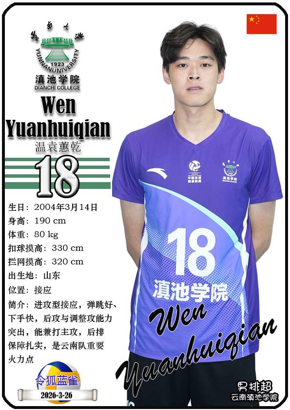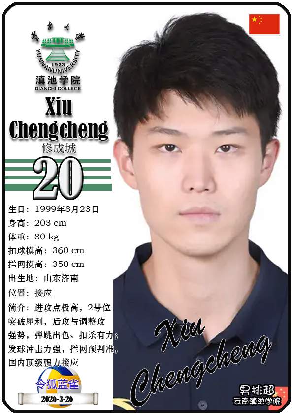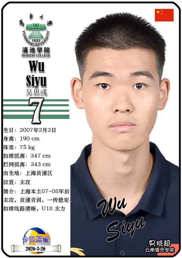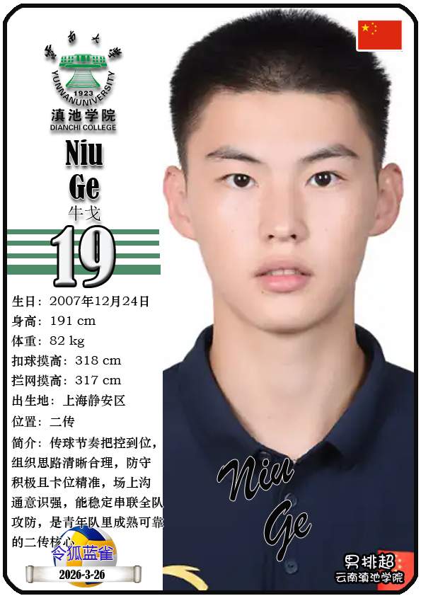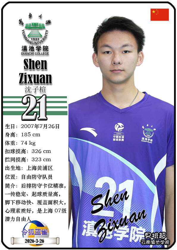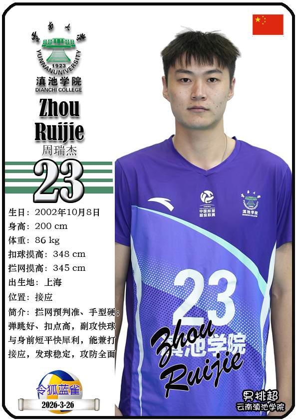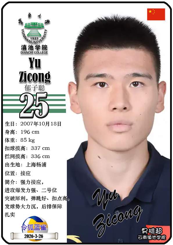 注5、所有球星卡为人工制作,非AI生成。本篇内容数据来源:排超官网-云南滇池学院男子排球队,https://league20252026.volleyballchina.com/teamDetail?teamId=27