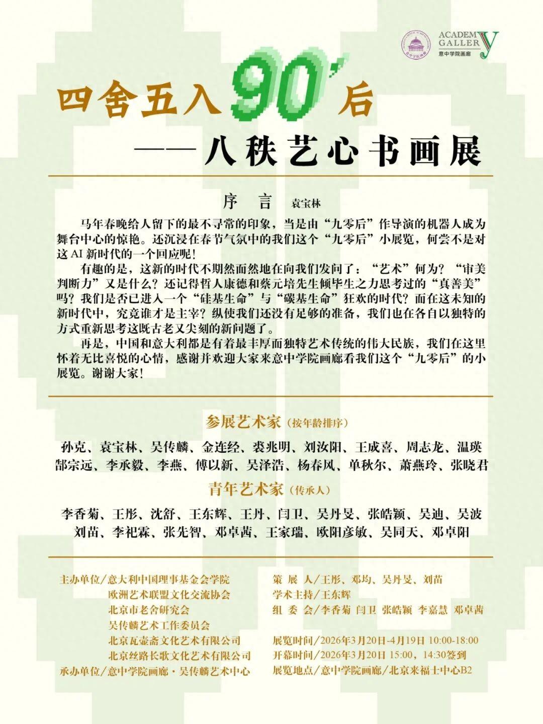 【编者按】2026年3月20日,“四舍五入90后——八秩艺心书画展”在北京来福士意中学院画廊·吴传麟艺术中心开幕。本次展览以“90后”为主题命名,汇聚当代书画界老中青三代艺术名家与青年传承力量,在中意文化交流的艺术平台上,以传统笔墨对话AI时代,生动诠释东方艺术的传承与革新。