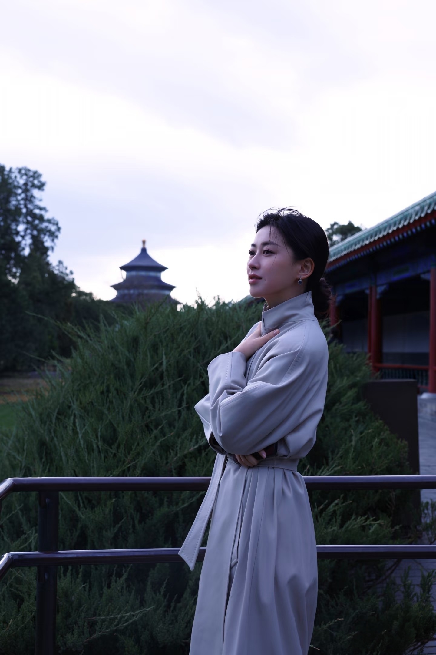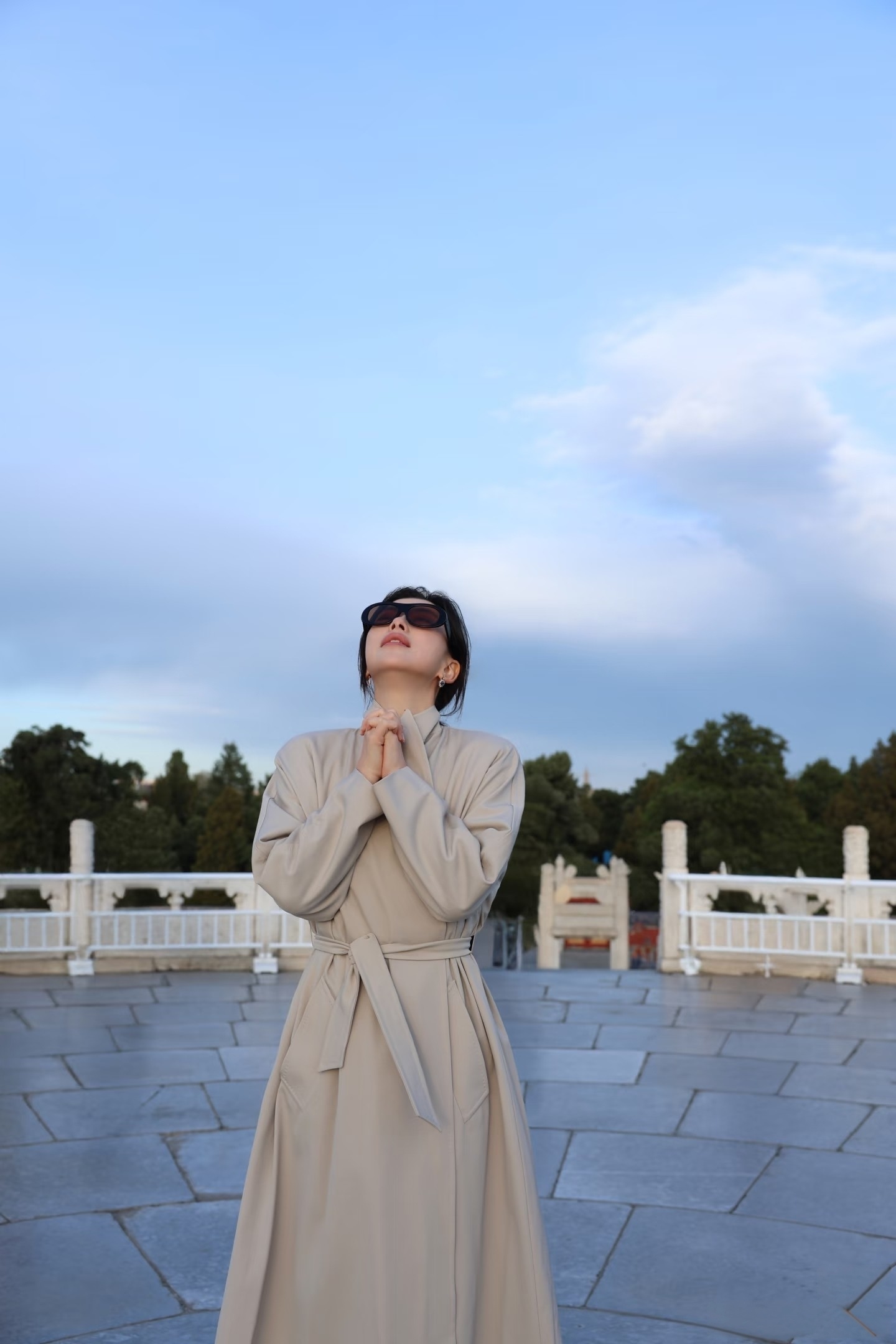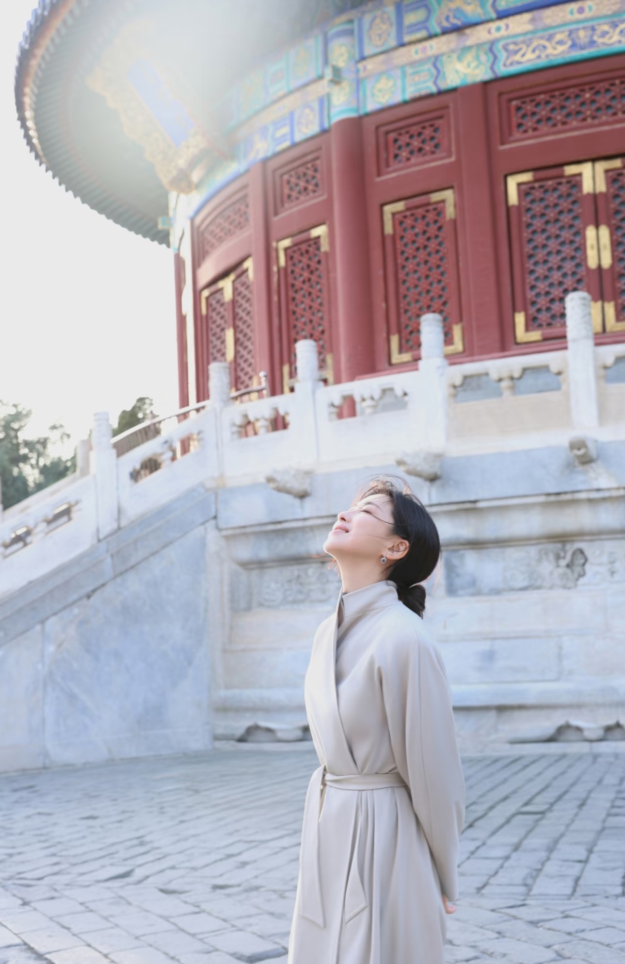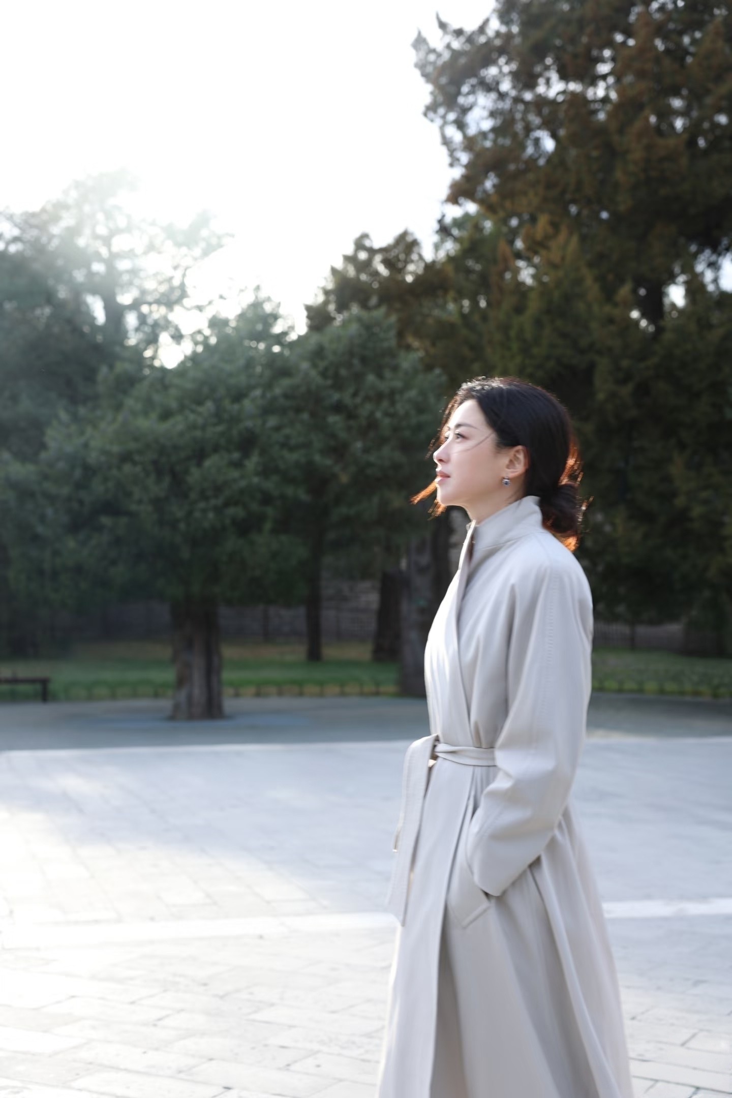 朱珠天坛看日落,穿长款风衣,气质优雅,文艺美丽!