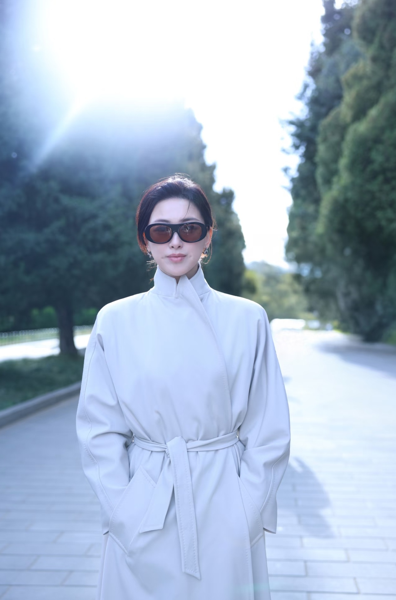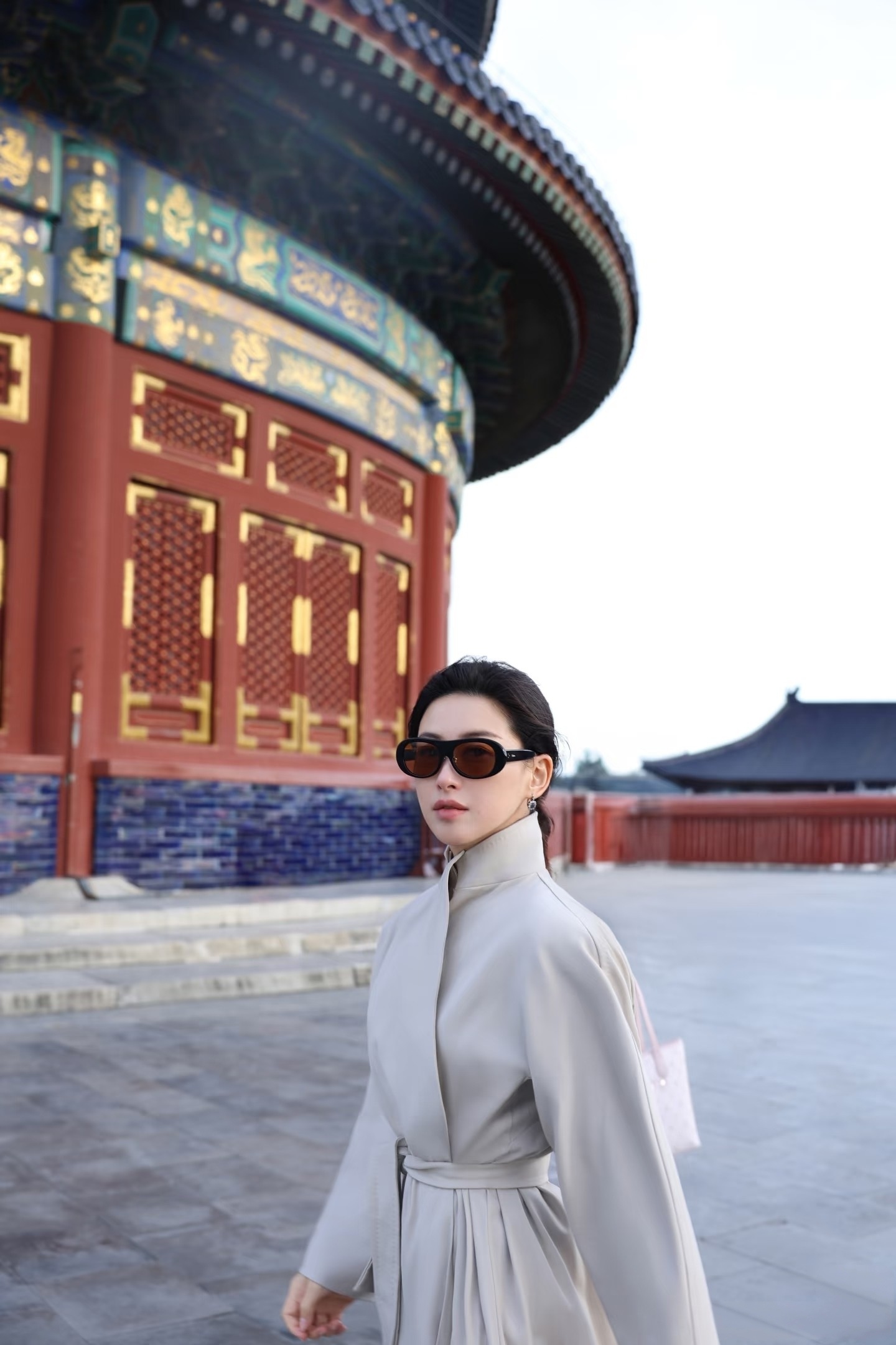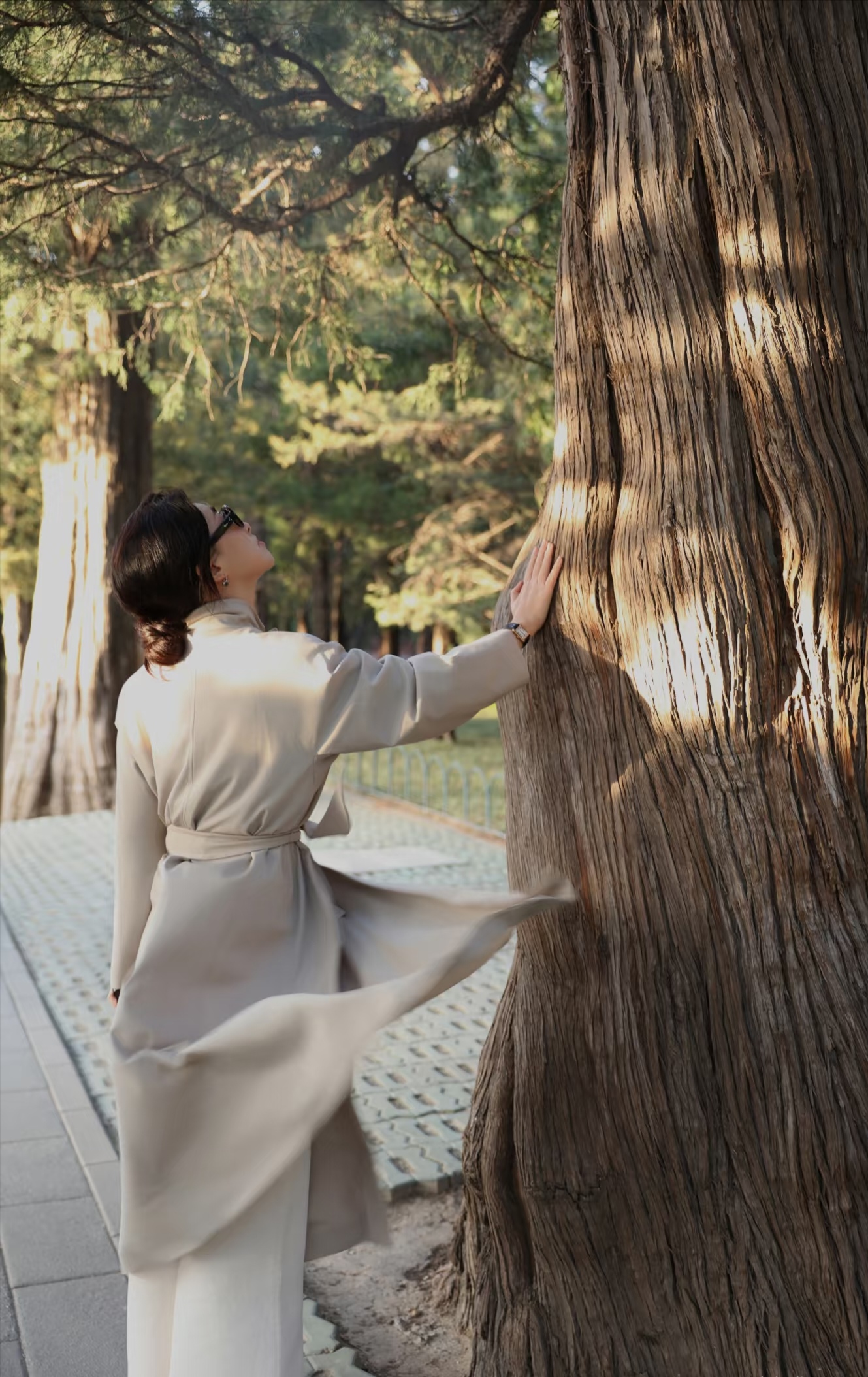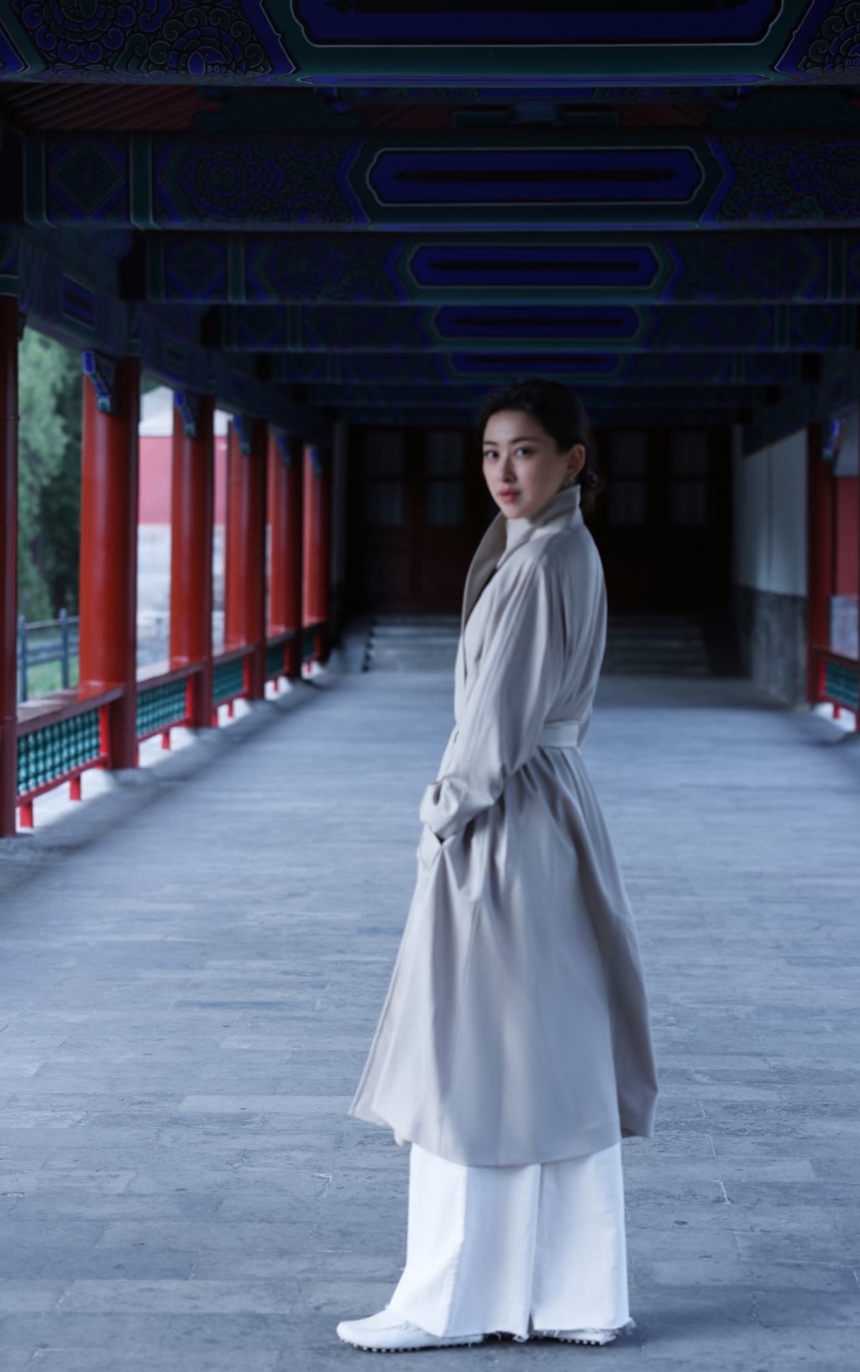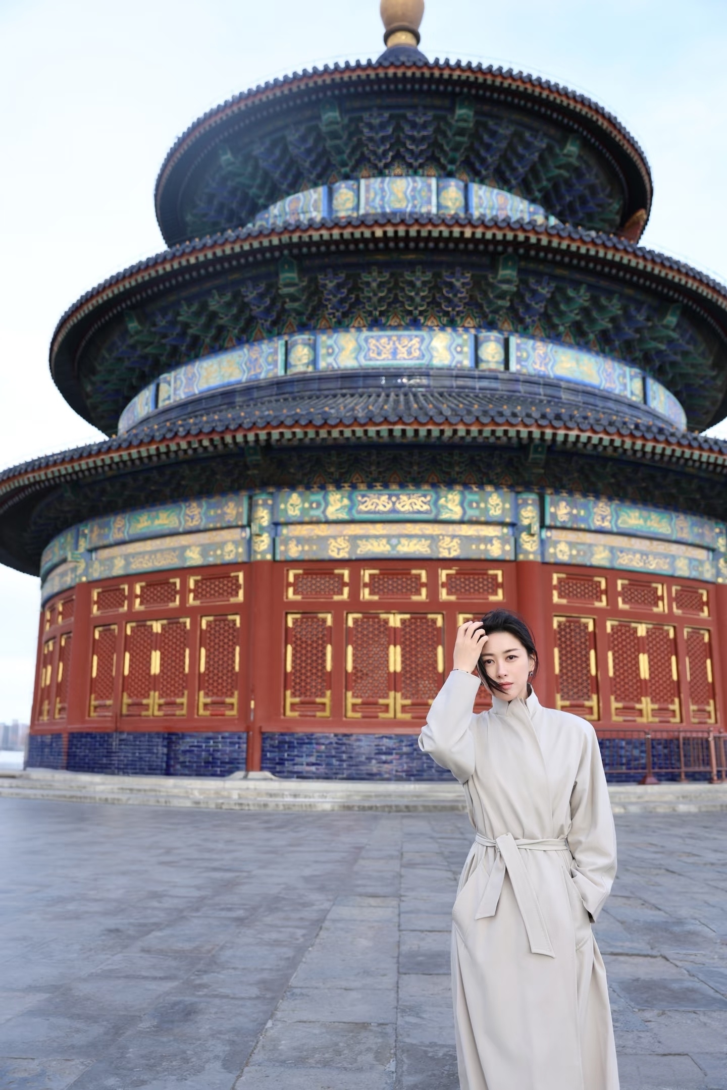 朱珠天坛看日落,穿长款风衣,气质优雅,文艺美丽!