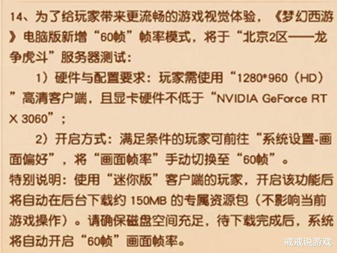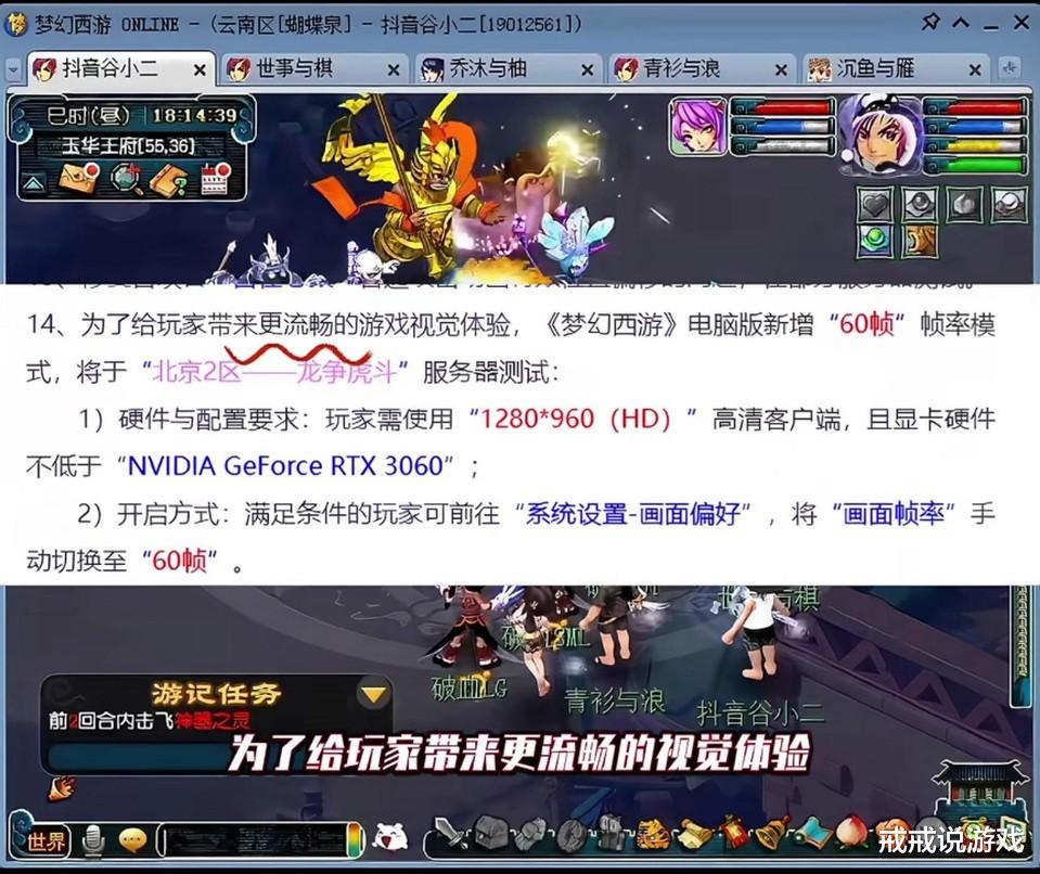 兄弟们梦幻西游出60帧模式了,注意戒戒说的不是手游而是端游,那个运行了二十多年、一直锁30帧的梦幻西游电脑版,终于在2026年4月7日维护后,实装了60帧模式。目前游戏只在“北京2区龙争虎斗”服务器开启测试。等了23年60帧终于来了,但还没等大家高兴太久,一个消息让整个社区炸了锅。想开60帧?可以,显卡必须达到NVIDIA GeForce RTX 3060及以上级别。而且目前只支持N卡,A卡用户直接被拒之门外!