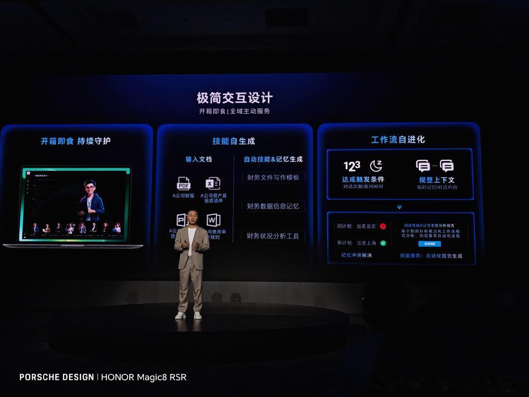 开机即食,告别复杂配置:荣耀将深度优化的AI智能体(5大主虾、23个子虾)深度预制进系统,覆盖教育、办公、学术、内容创作、智能辅助五大场景。用户无需学习,扫描二维码登录后即可通过微信、飞书等日常工具直接调用。AI能清晰告知自身技能,并具备自主进化能力,在使用中不断学习用户的文档与风格,越用越贴心,如同拥有了一位功能明确、持续成长的数字同事。