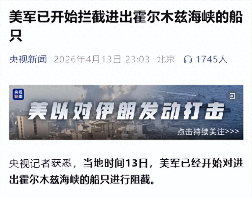 据央视新闻最新报道,美军已经开始对进出霍尔木兹海峡的船只进行拦截,据美军中央司令部的说法,美军将对所有进出伊朗港口的海上交通实施封锁。