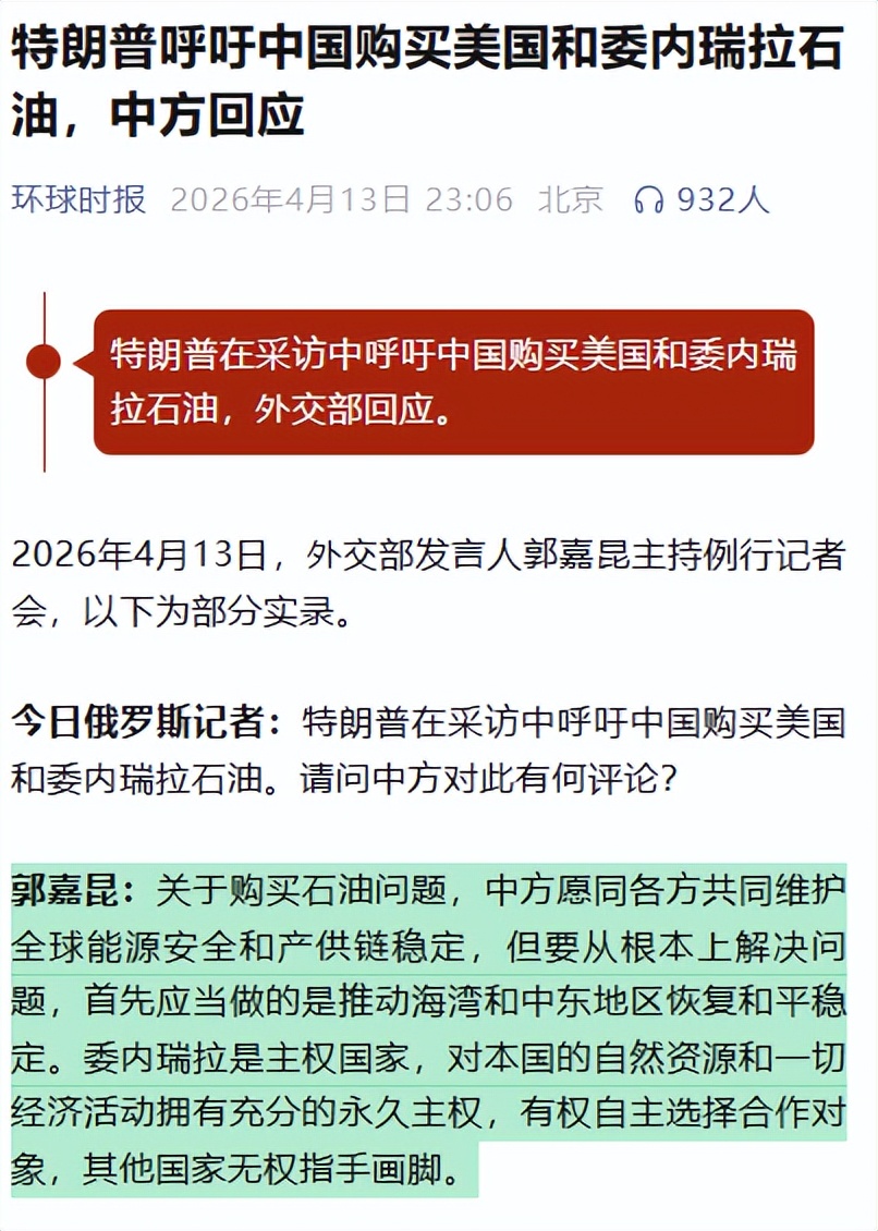 特朗普呼吁中国购买美国和委内瑞拉石油,中方表态释放信号4月13日,外交部发言人郭嘉昆主持例行记者会,针对特朗普呼吁中国购买美国和委内瑞拉石油的提问作出明确回应。