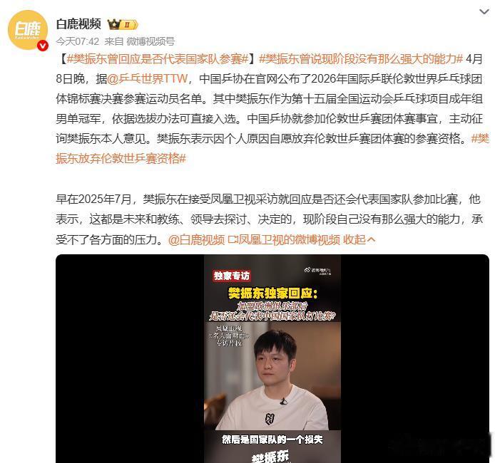 至于樊振东弃权,国内媒体今日也重点报道,甚至登上了热搜!樊振东其实在去年7月份接受《凤凰卫视》采访的时候,就已经回应是否会继续代表国家队出战,他当时的答案是暂时不会,因为在小胖看来,他没有强大的能力,来承受各方面的压力!