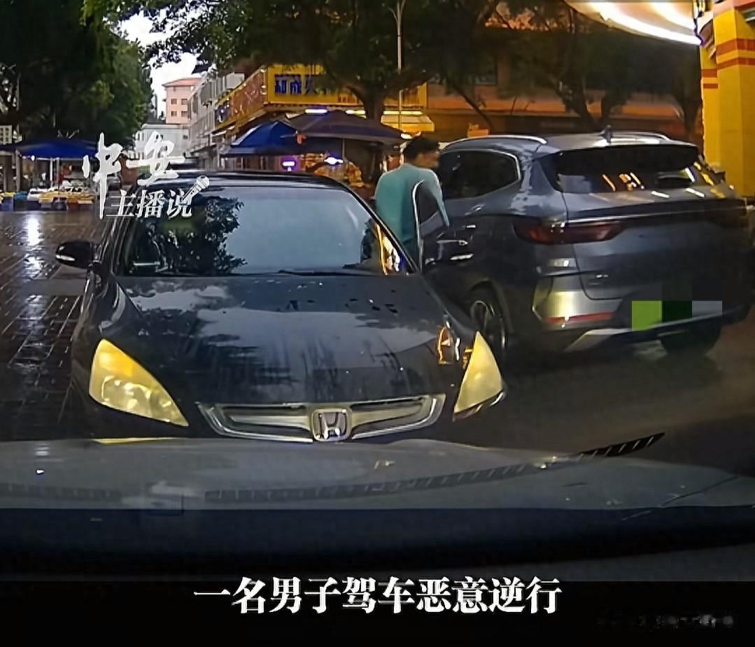 梅州新荣街这条单行道上车辆川流不息。一男子穿着青色上衣,开着一辆看起来有些年头的轿车,不顾单行道标识,硬是逆向冲进车流,然后“啪”地一声把车横在路中间,正好堵死整个通道。