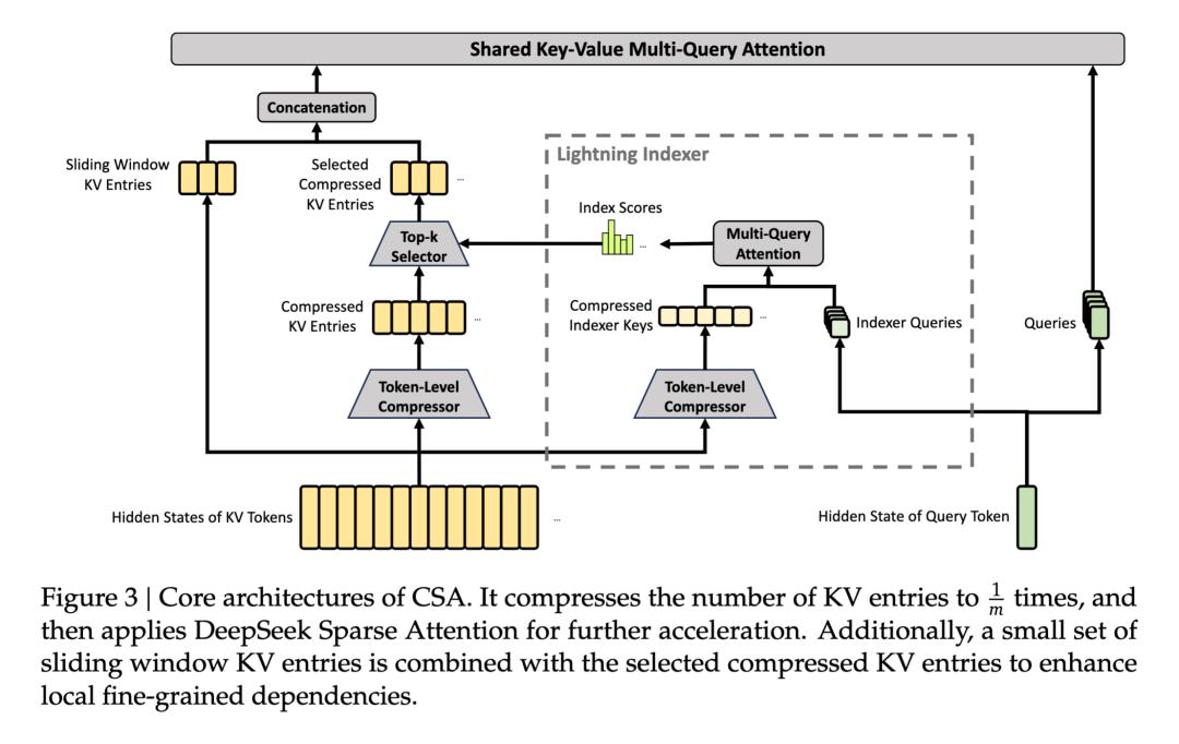 V4 这次更进一步,把稀疏化推进到了上下文本身:不是所有历史 token 都以同等分辨率进入注意力,而是经过压缩、筛选、分层之后,再被模型使用。