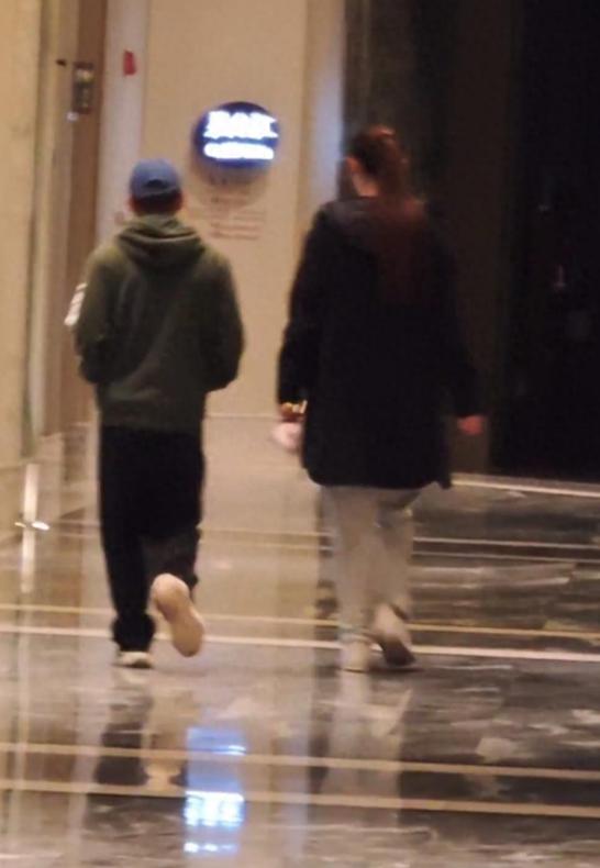 而一旁的他穿着绿色的卫衣,黑色的休闲裤,头上还带着蓝色的棒球帽,看得出来两人都没想太招摇。