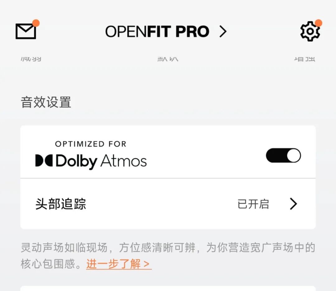 OpenFit Pro是韶音首款支持杜比音效和头部追踪的开放式耳机,相关功能默认关闭,可在Shokz App里开启。初次使用,App会引导用户做头部追踪校准,跟着提示做几个头部动作就能很快完成。我之前体验过的一些支持空间音频的开放式耳机,头部追踪会提供“静态”和“动态”两种模式。“静态”是音源方位固定,“动态”是声场跟着头部移动实时调整,OpenFit Pro的头部追踪是后一种。它的响应速度不算快,我坐在转椅上从正面向右转了90°,声音方向还留在左耳那侧,大概三四秒后声场才重新归位到我面朝的正前方。