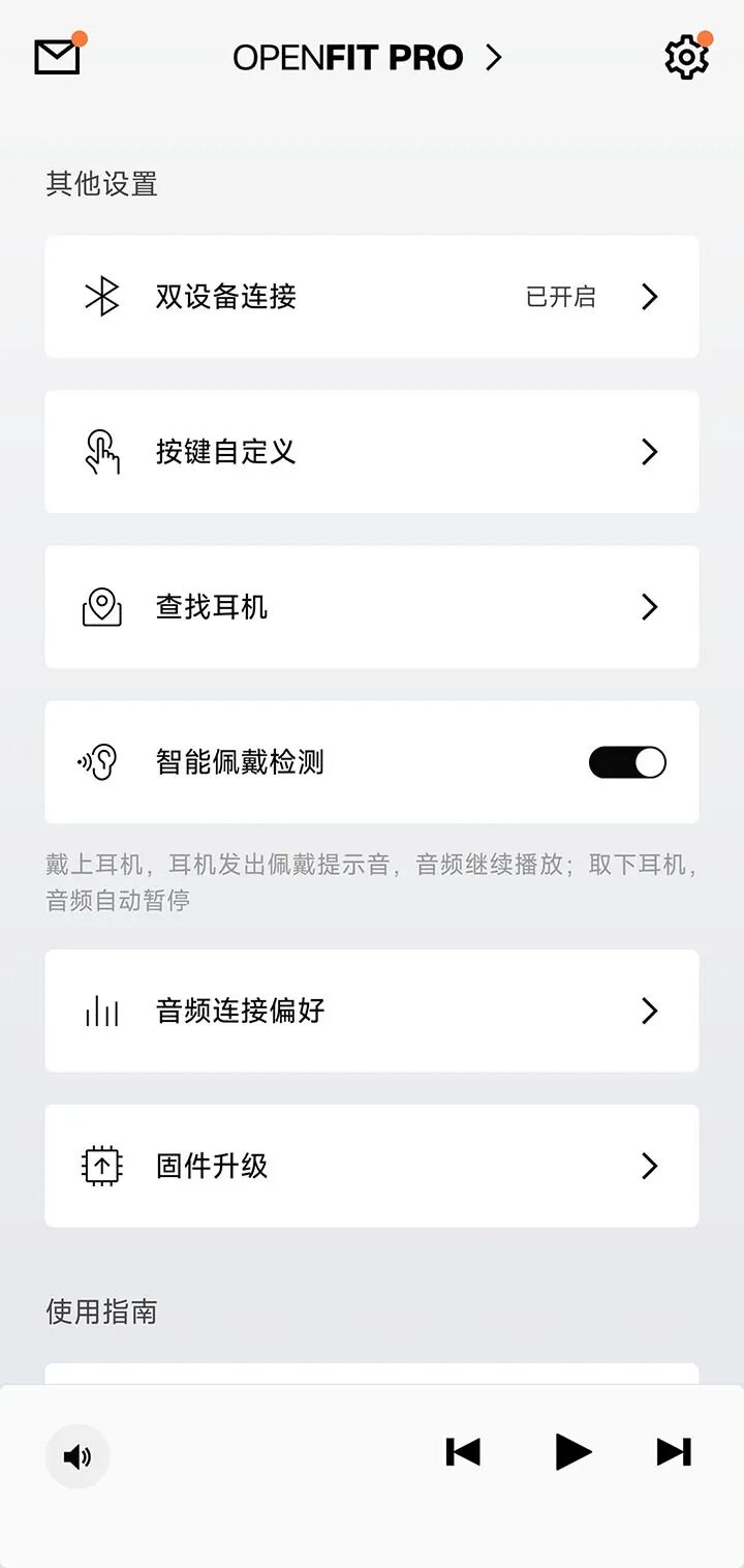 在开放式耳机的操控方式上,韶音是经过了几次尝试的。OpenFit用了触控设计,整体性好、美观但容易误触,运动时碰到尤其烦人。到OpenFit 2上把实体按键加回来,口碑好了很多。OpenFit Pro保留了实体按键,采用一体式设计,与机身的整体性保持得很好。两只耳机上都有,位于耳机主体顶部靠前位置,微微凸出,食指一摸就能定位,盲操作方便。单击、双击、三击和长按按键对应不同功能,用户还可以在App里自定义这些操作对应的功能,甚至可以关闭,充分满足了不同用户的个性化需求。