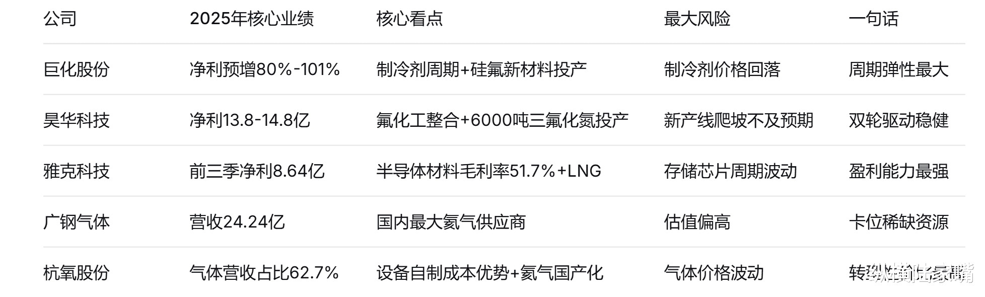 2026年,五家公司将面临业绩分化。巨化股份需面对制冷剂价格高位回调的风险;雅克科技需消化并购带来的财务压力;广钢气体需证明电子特气业务能否复制电子大宗气体的成功;杭氧股份需平衡设备与气体业务的关系;昊华科技需展现央企整合后的协同效应。
