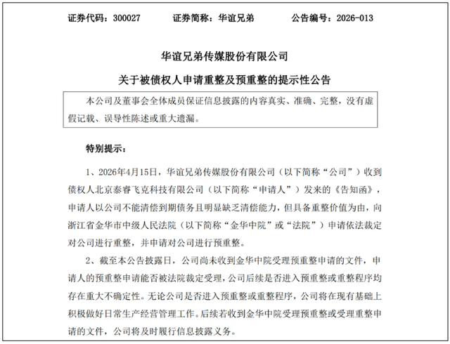 4月15日晚,影视圈炸出一条重磅消息——曾经的 “中国影视第一股” 华谊兄弟(300027.SZ),被债权人正式申请重整。