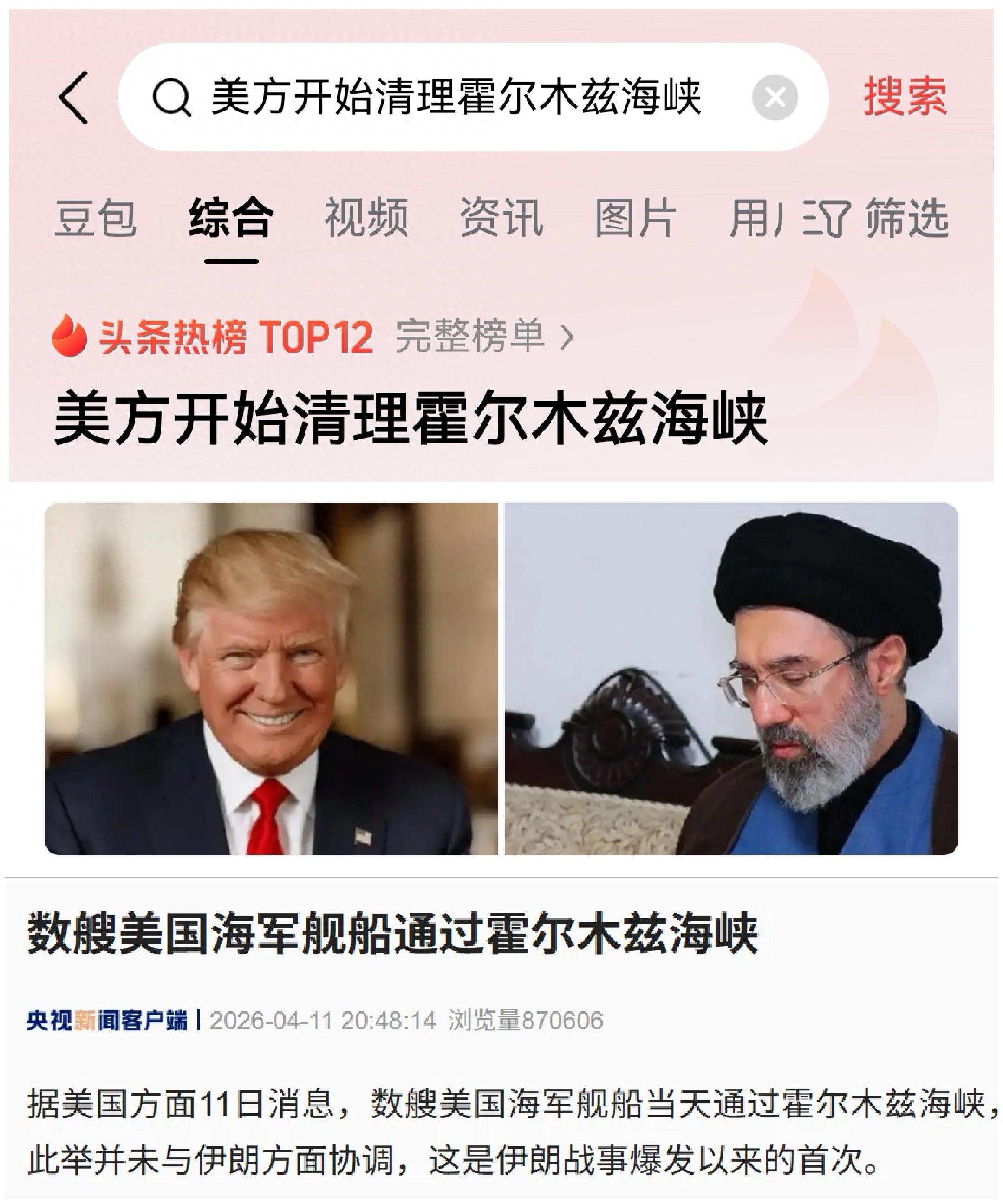 今天(2026年4月12日)一大早,两条话题依然死死焊在热搜榜上:#数艘美国军舰通过霍尔木兹海峡#排第六,#美方开始清理霍尔木兹海峡#排第十二。