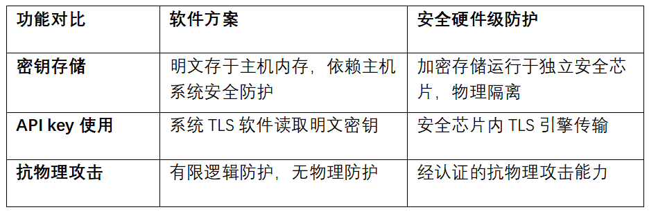 当前主流的Agents部署方案中,通信安全几乎完全依赖软件实现。API密钥以明文形式存储在设备本地的配置文件或Flash分区中,TLS会话密钥驻留在主机内存里。这套方案在云端环境或受控的开发环境中可以工作,但放到终端硬件产品的语境下,会面临三个结构性问题: