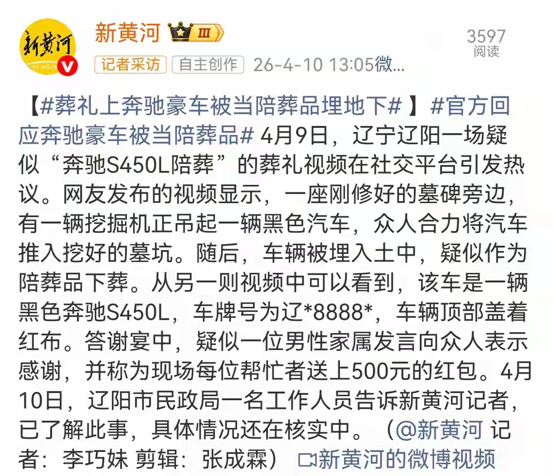 事件回顾2026年4月9日,一段引发热议的现场视频在社交平台传播开来。视频画面中,辽宁辽阳弓长岭区一处墓穴旁,挖掘机吊起一辆崭新黑色奔驰轿车,众人合力将车辆推入巨型墓坑后覆土完全掩埋。