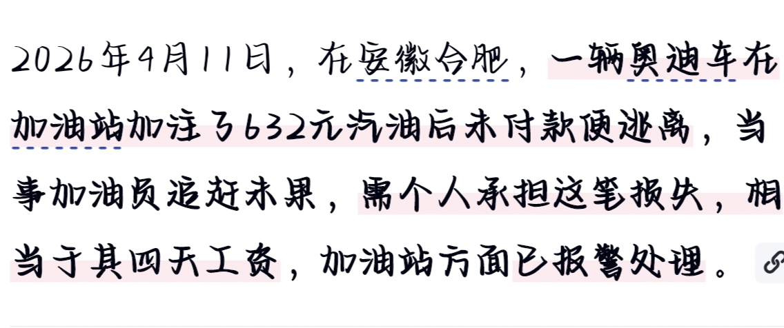 4月11日,安徽合肥,一辆奥迪车加完632块钱的油,一脚油门跑了。加油工追了两次都没追上,最后这笔钱是她自己掏的,等于四天工资打了水漂。