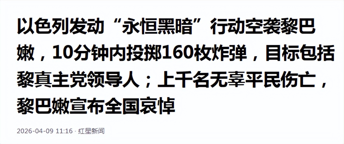 参考资料:红星新闻《以色列发动“永恒黑暗”行动空袭黎巴嫩,10分钟内投掷160枚炸弹,目标包括黎真主党领导人;上千名无辜平民伤亡,黎巴嫩宣布全国哀悼》发布时间:2026.4.9
