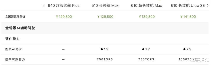 Max版——单颗自研图灵芯片,750TOPS有效算力,比老款双Orin-X的508TOPS还高。支持高速NGP、城市NGP、自动泊车全场景覆盖,13万出头买到的最强智驾,没有之一。