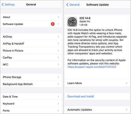 步骤 3:如果有可用更新,它将显示在设备上。点击“下载并安装”。( iPhone 软件更新失败?)