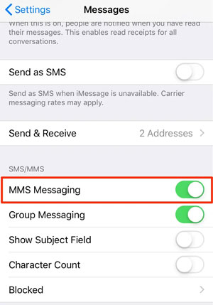步骤 2. 如果“彩信”选项已禁用,请点击该选项上的开关将其打开。