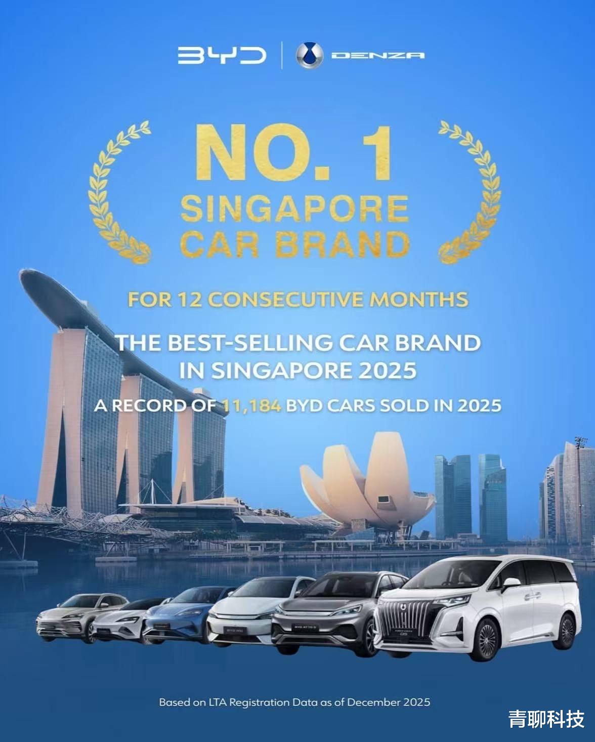 2025年,比亚迪乘用车在新加坡卖了11184辆,同比暴涨80.6%,蝉联全品牌销冠。更关键的是,每卖出五辆新车,就有一辆是比亚迪,市占率21.2%,丰田、宝马被远远甩在后面。