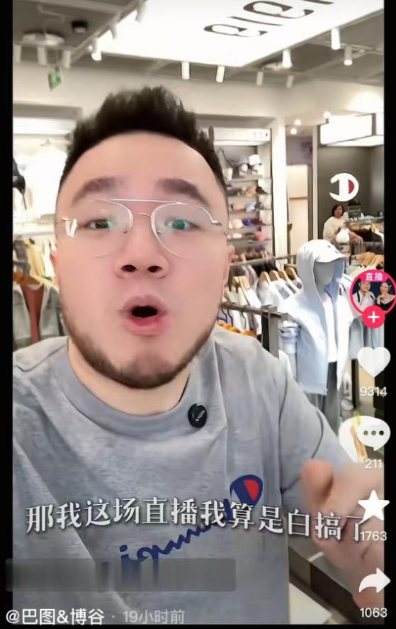 马上夏天要来了,他们开始在直播间里面买短袖,画面中,巴图举着手机站在品牌商店里面,