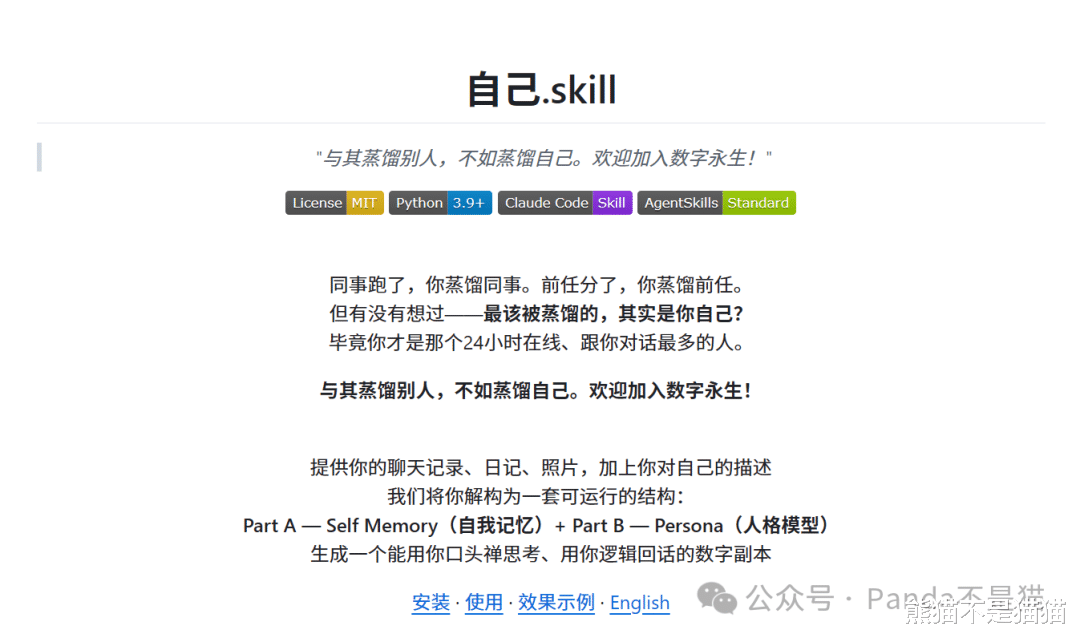 如果是个人使用,这里熊猫最推荐的其实还是yourself-skill,也就是蒸馏自己。