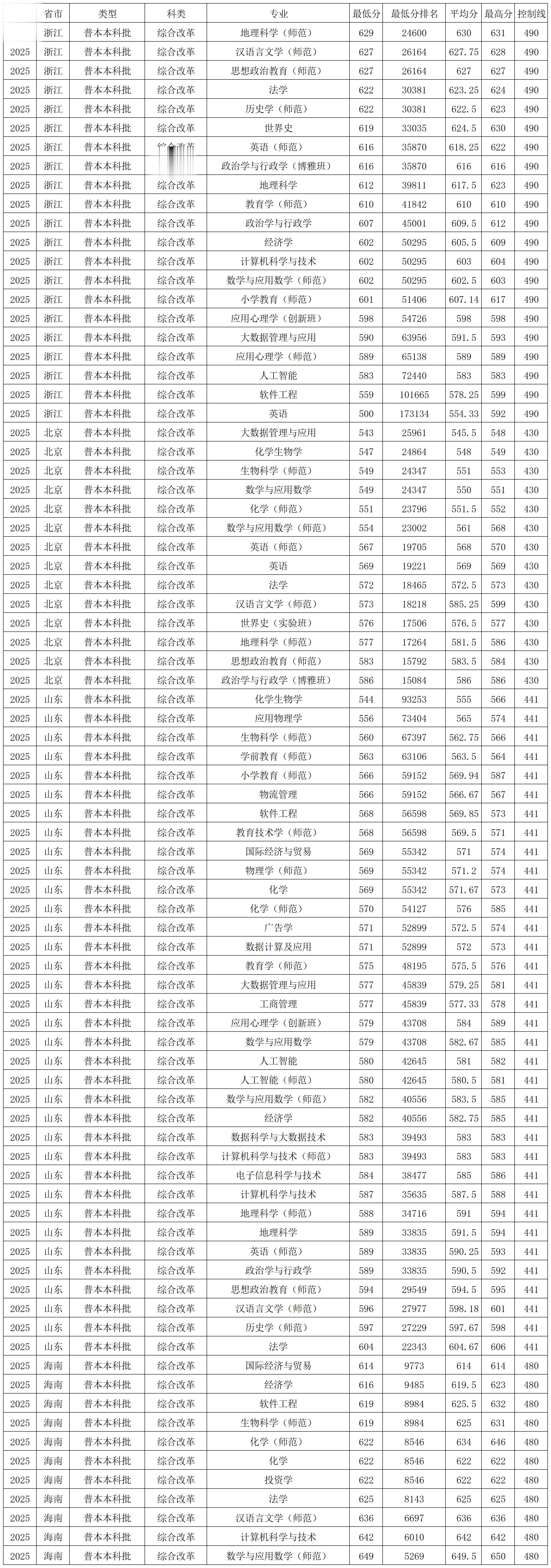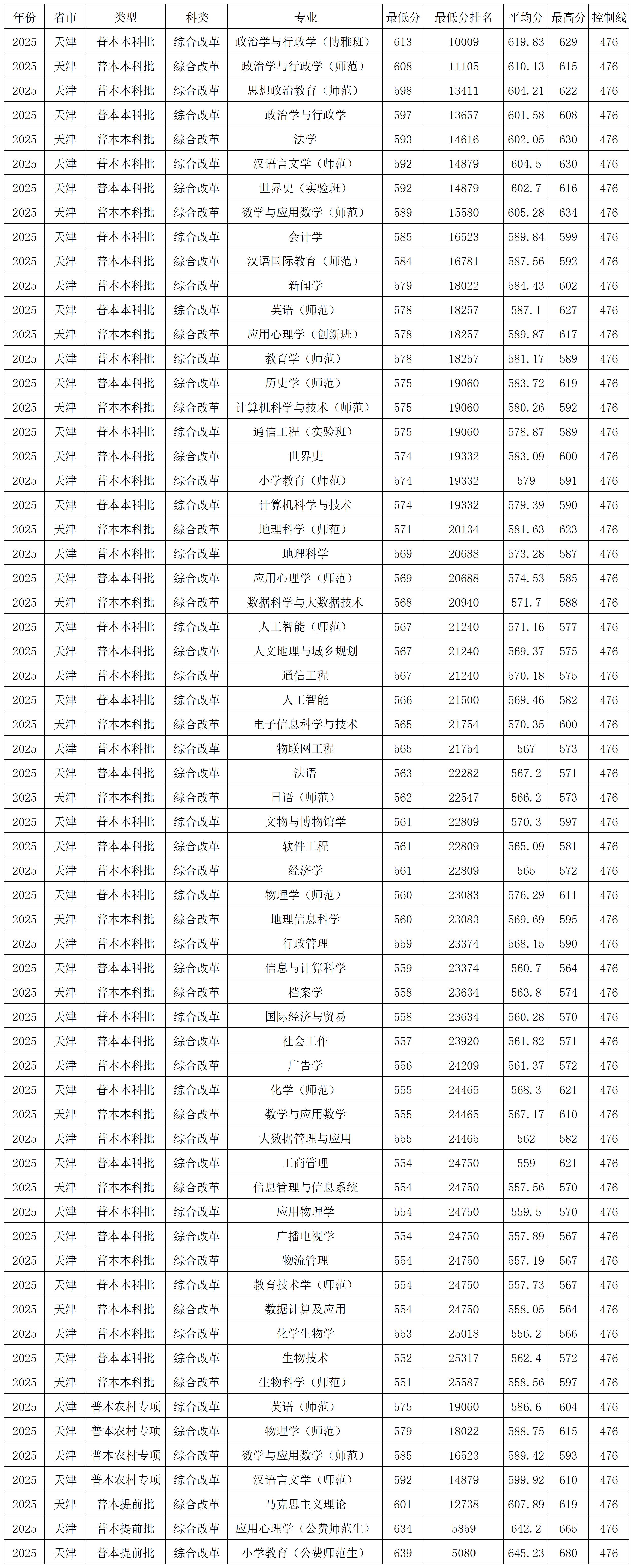 天津师范大学2025年提前批、国家专项、预科班在各省各专业录取分数线